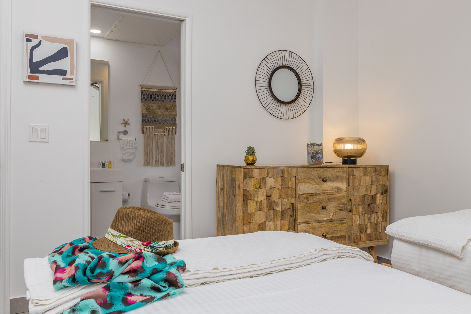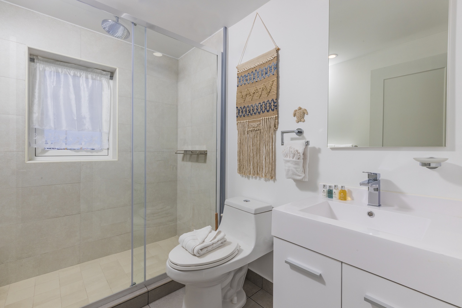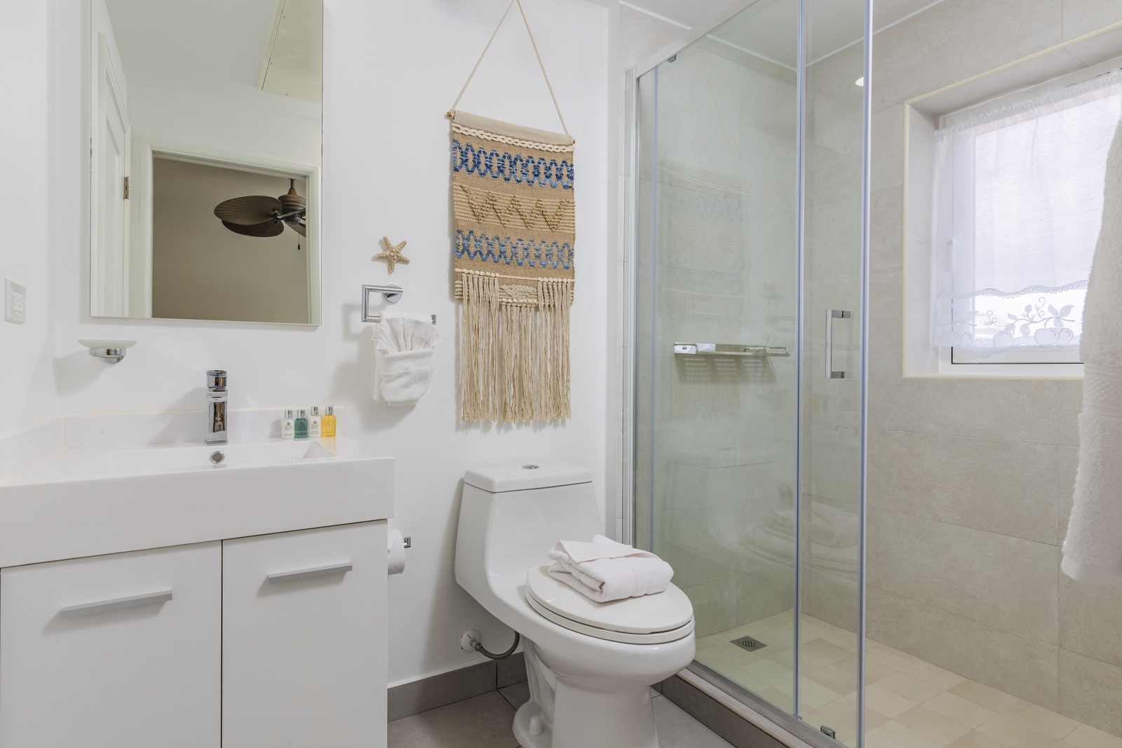 • Bathroom has their own white towels and blue beach towels in the vanity.