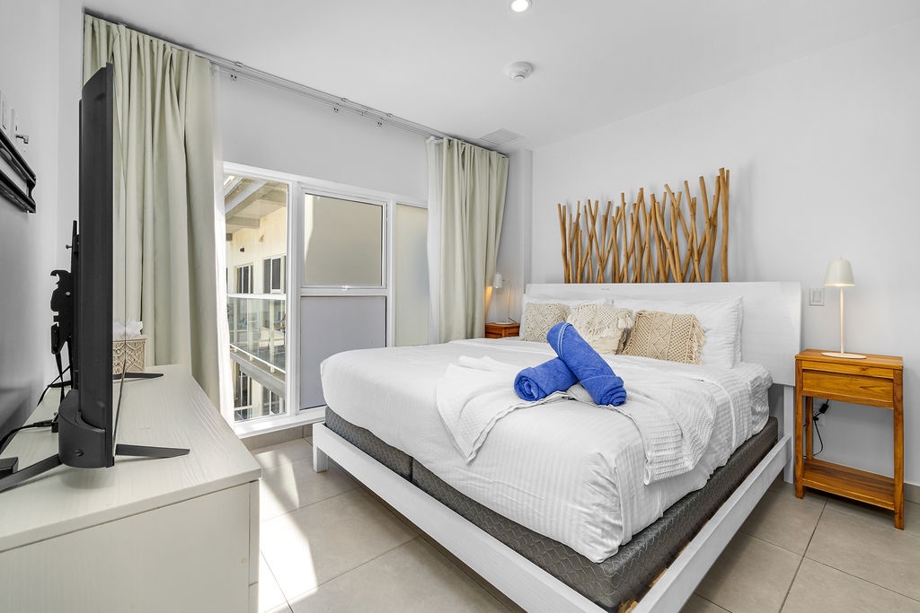 The master bedroom boasts a plush king bed, while the second bedroom offers a comfortable queen bed, ensuring a restful night's sleep for all. Both bedrooms are air-conditioned and have ample closet space, including hangers for your convenience.