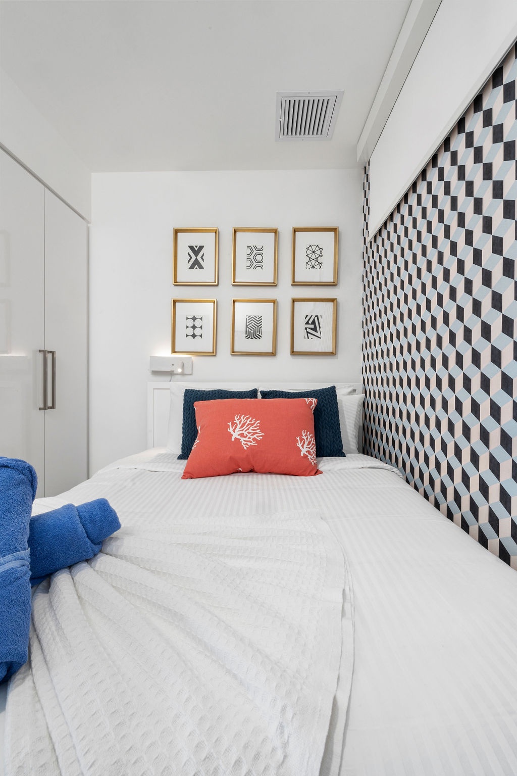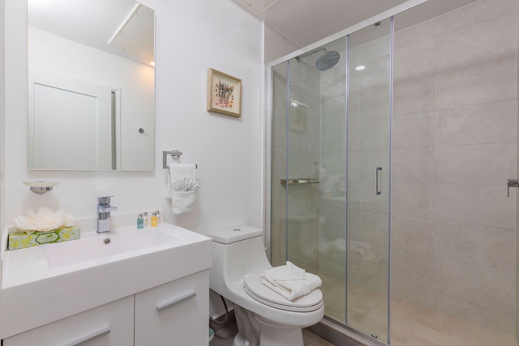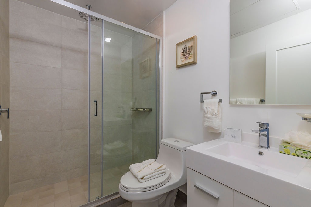 • Bathroom has their own white towels and blue beach towels in the vanity.