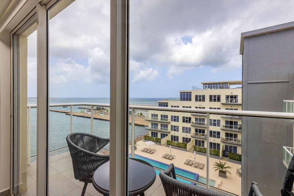• A stunning infinity pool overlooking the Oranjestad Marina wit tropical deck create a relaxing environment at the center of the complex with poolside lounges and umbrellas from 8:00 am to 9:00 pm.