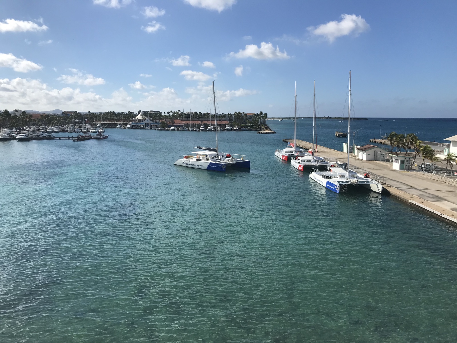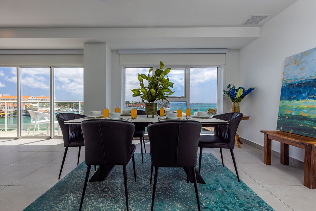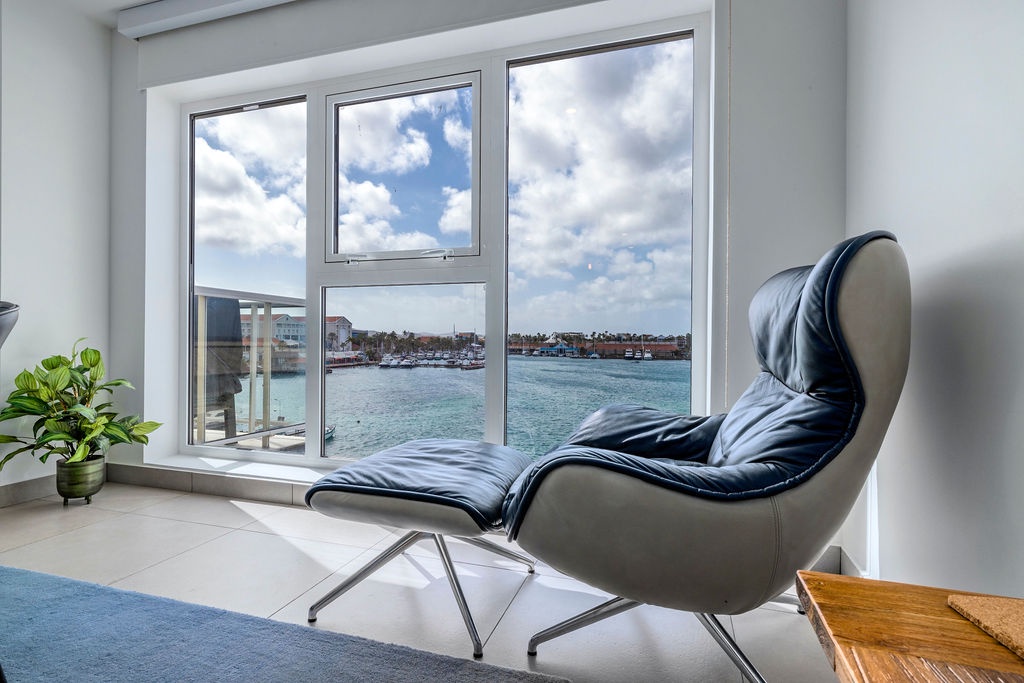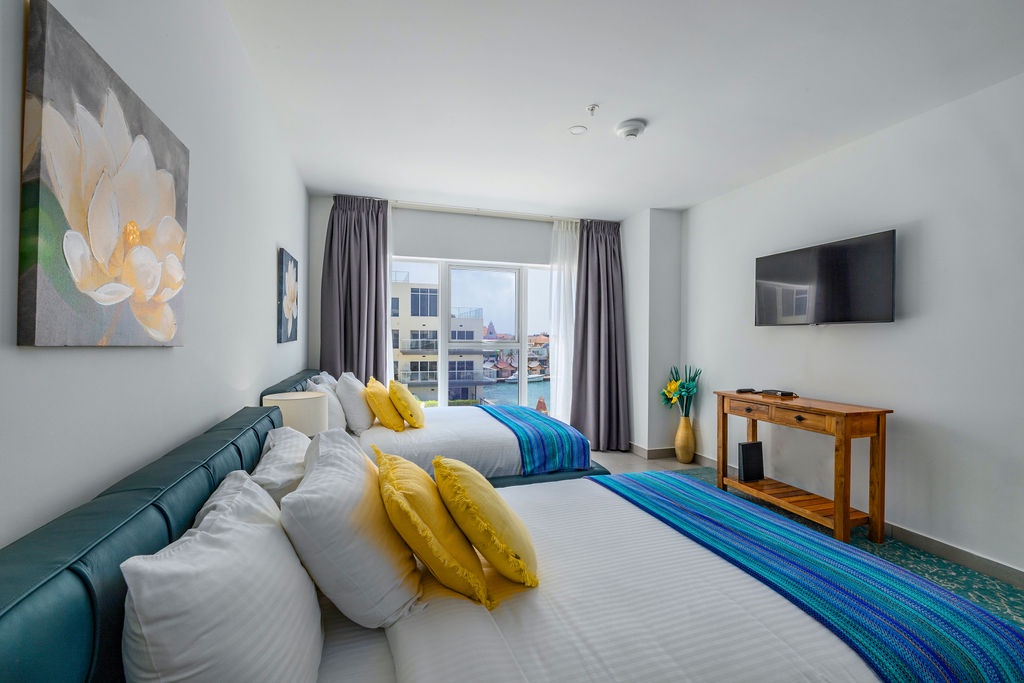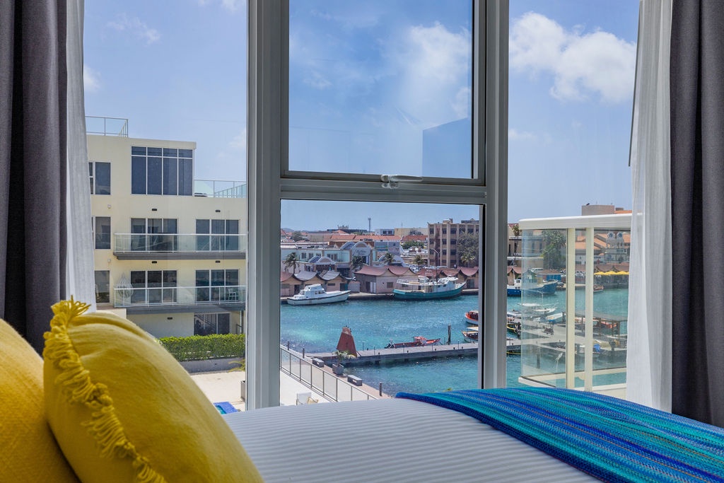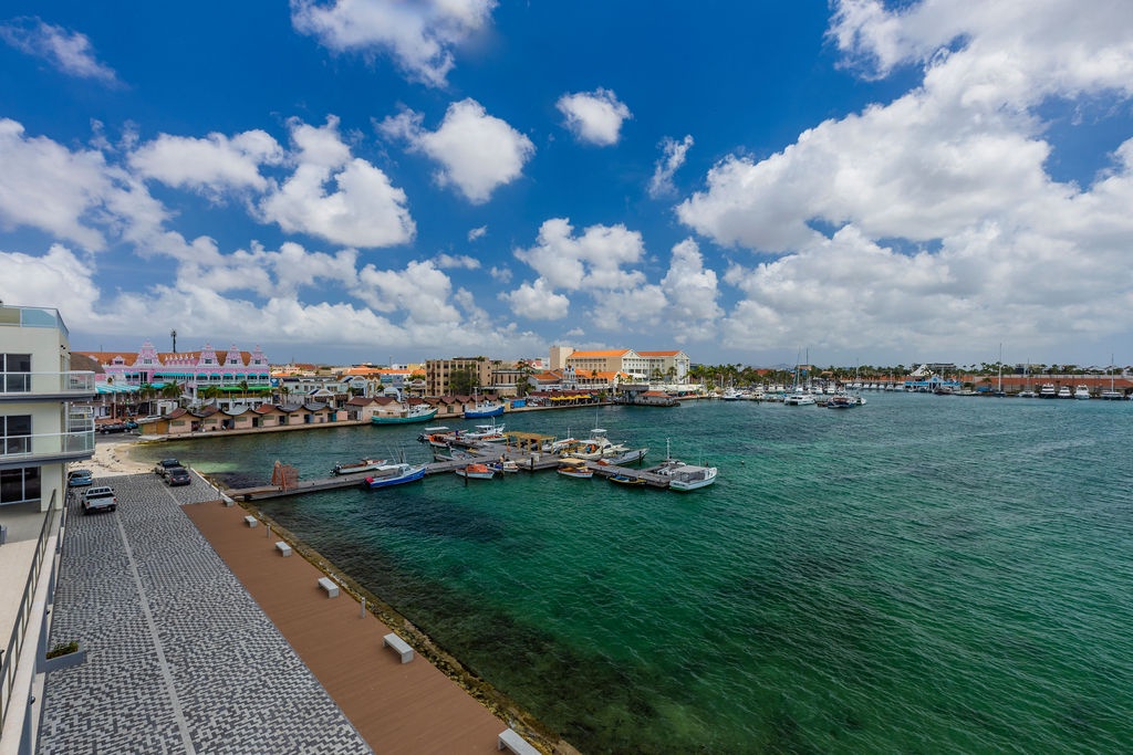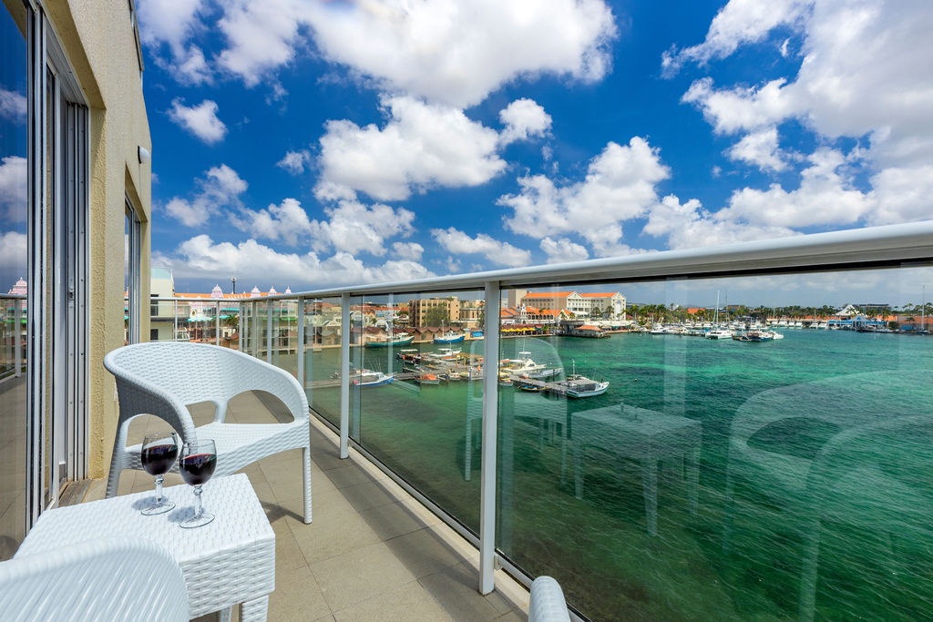 • A stunning infinity pool overlooking the Oranjestad Marina wit tropical deck create a relaxing environment at the center of the complex with poolside lounges and umbrellas from 8:00 am to 9:00 pm.