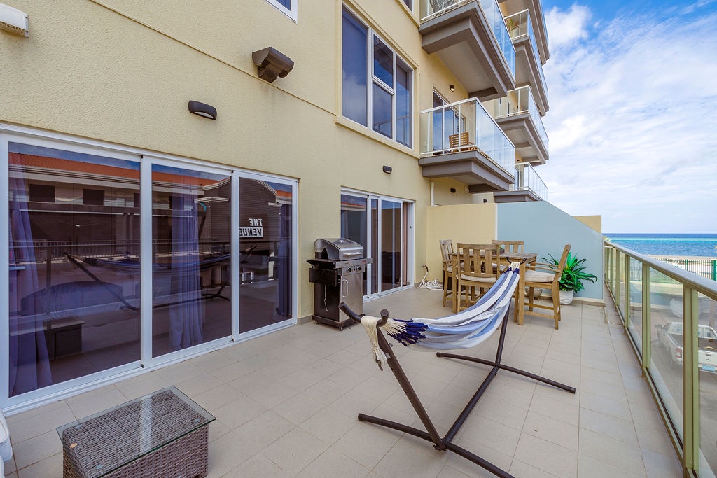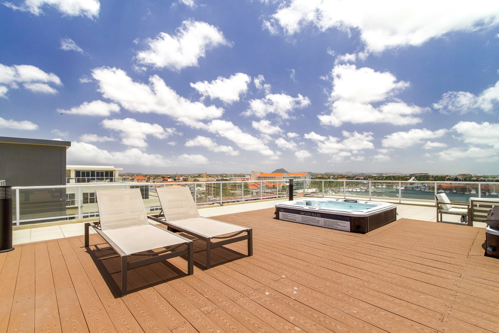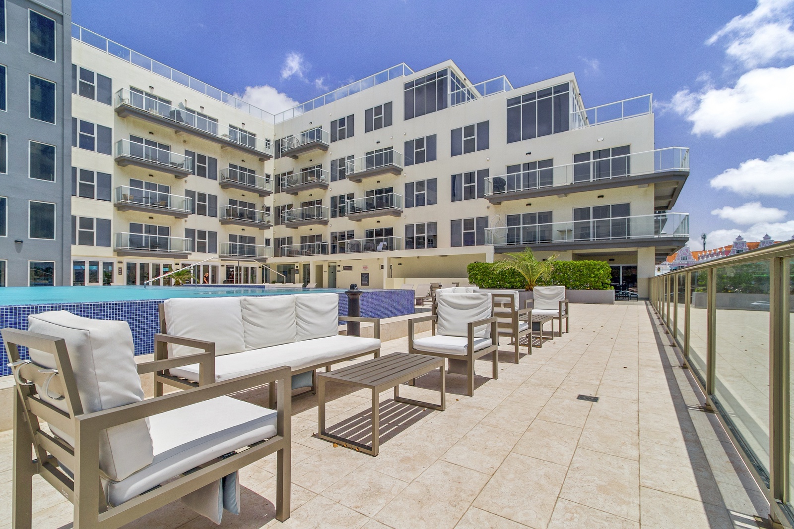• A stunning infinity pool overlooking the Oranjestad Marina wit tropical deck create a relaxing environment at the center of the complex with poolside lounges and umbrellas from 8:00 am to 9:00 pm.