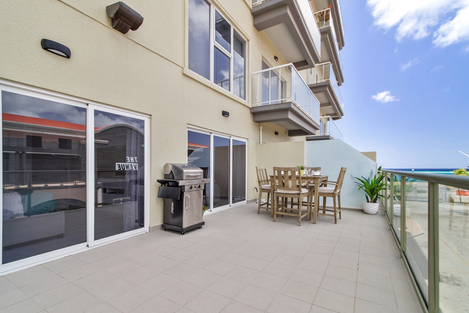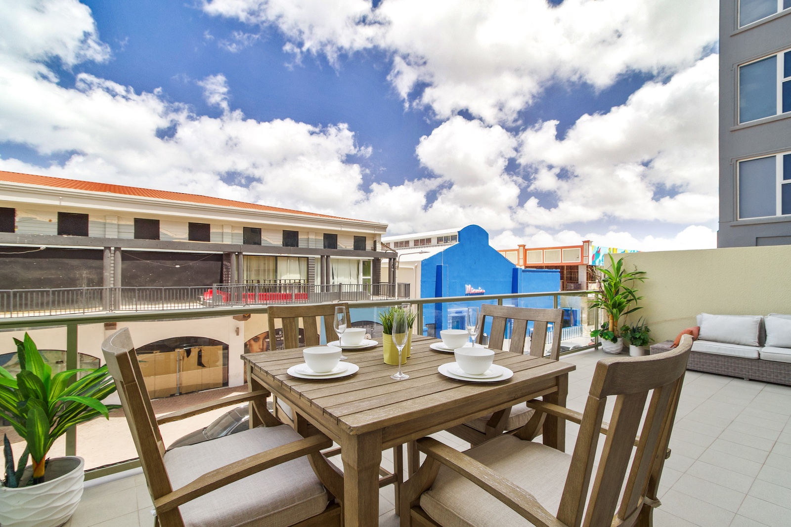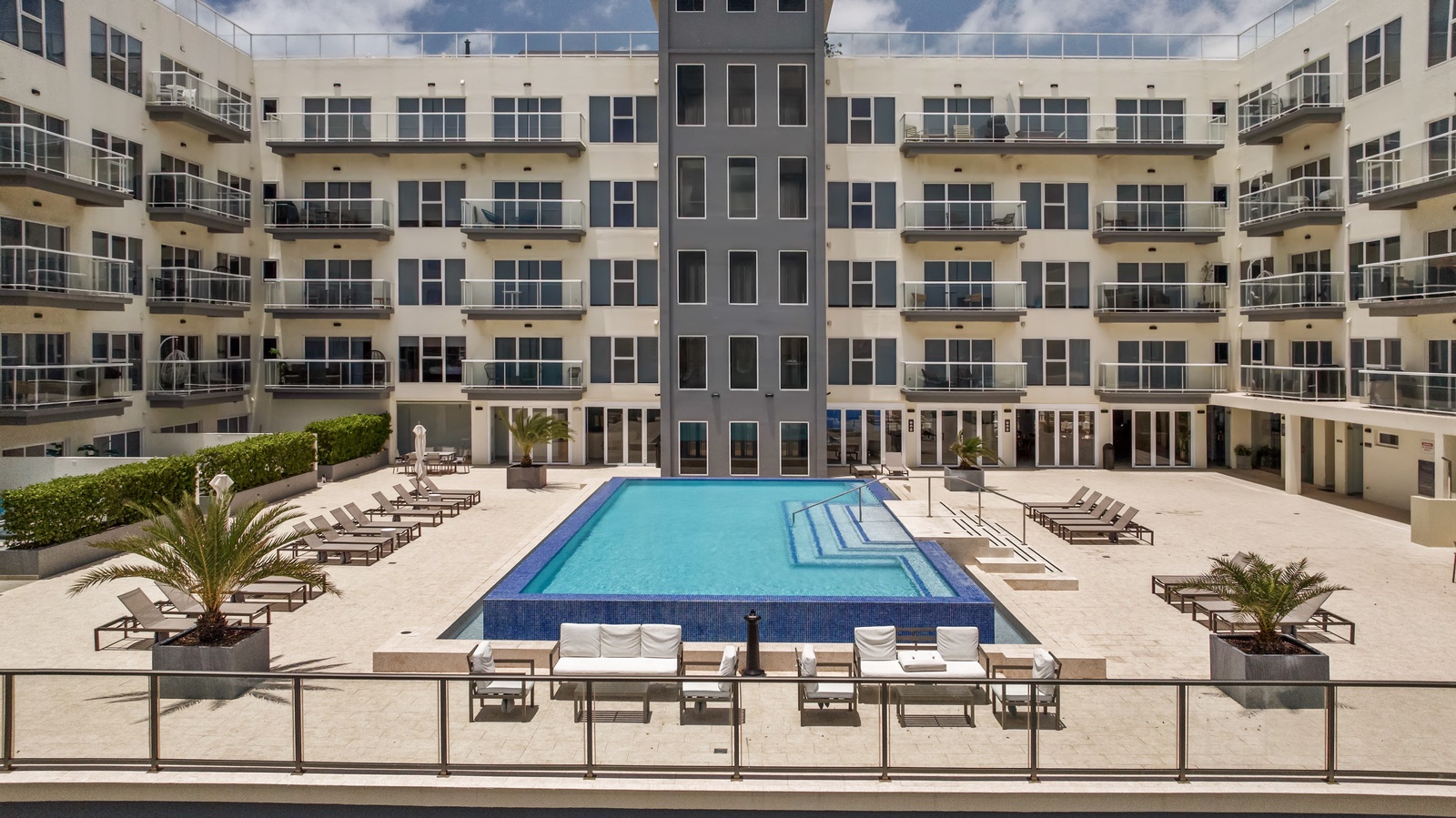• A stunning infinity pool overlooking the Oranjestad Marina wit tropical deck create a relaxing environment at the center of the complex with poolside lounges and umbrellas from 8:00 am to 9:00 pm.