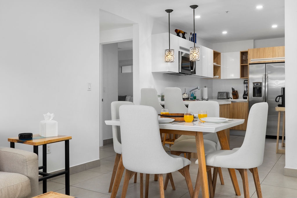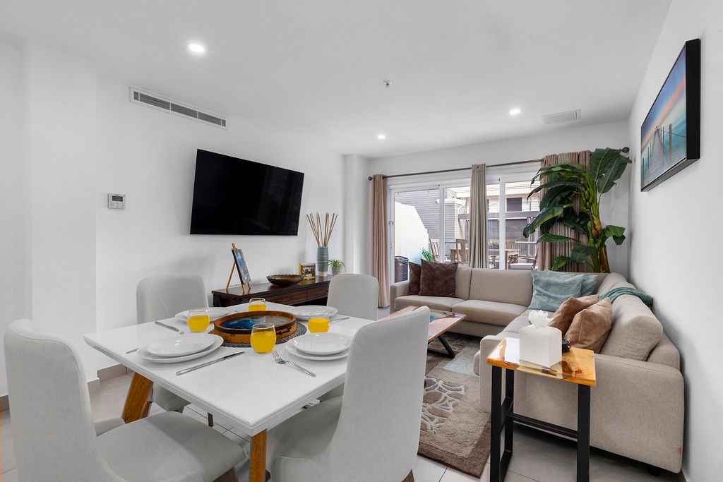 This air-conditioned two-bedroom apartment features one queen-size bed, two full sized beds and one full bathroom with shower, hairdryer, living room with a wide open balcony with BBQ and a fully equipped kitchen. Washer and dryer in the unit. Free Wi-Fi and Cable TV.