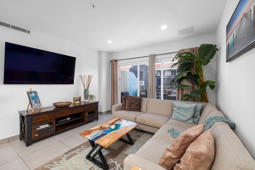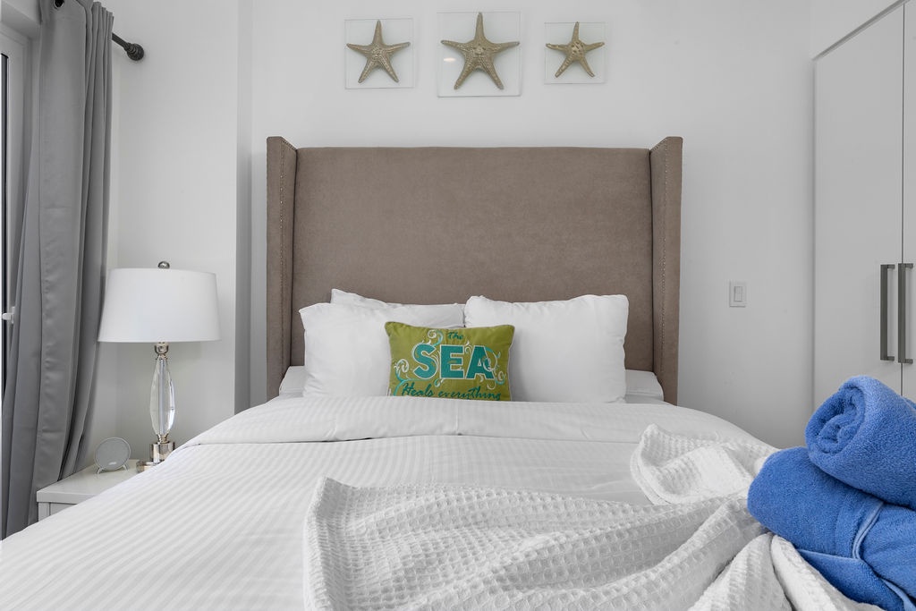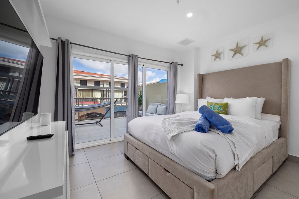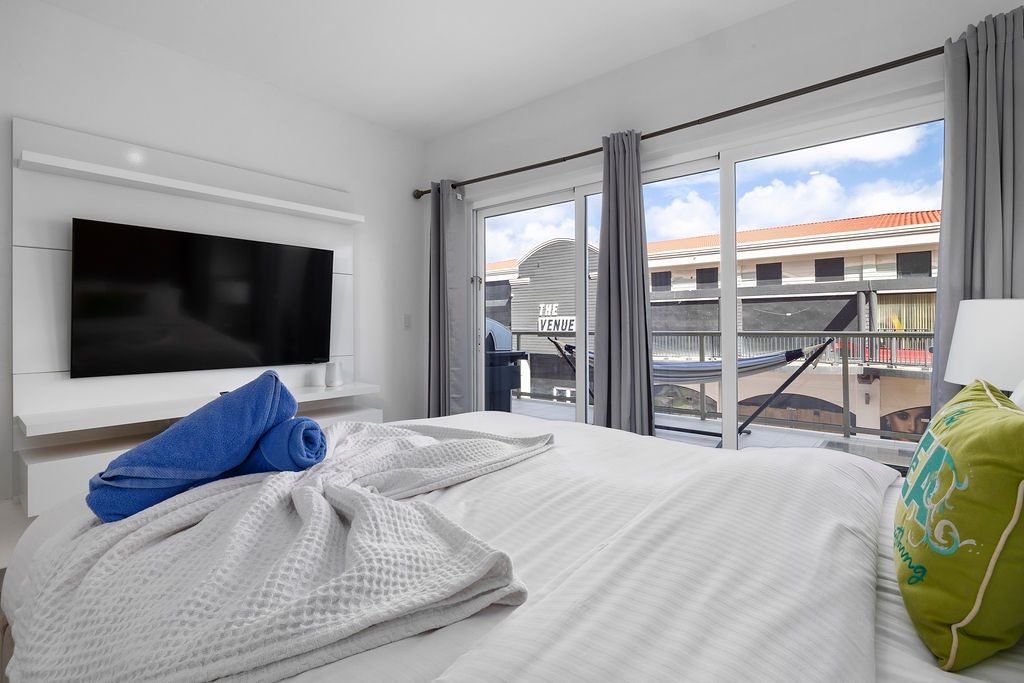 The master bedroom also has a balcony, Flat screened TV, a queen sized bed with quilted pillow top mattress which offers a comfortable and relaxing night sleep..