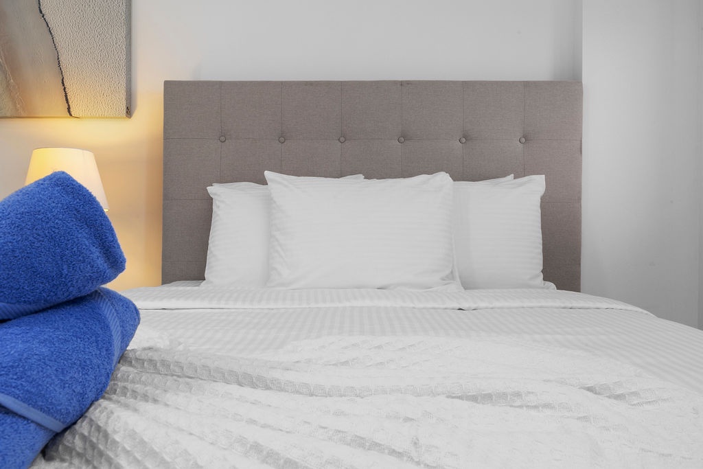• Bathroom has their own white towels and blue beach towels in the vanity.