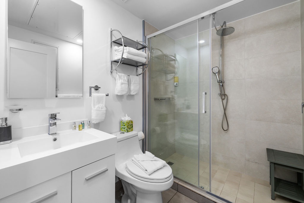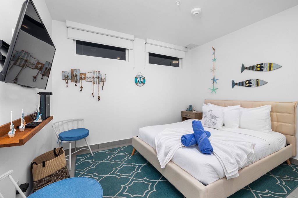 • Bathroom has their own white towels and blue beach towels in the vanity.