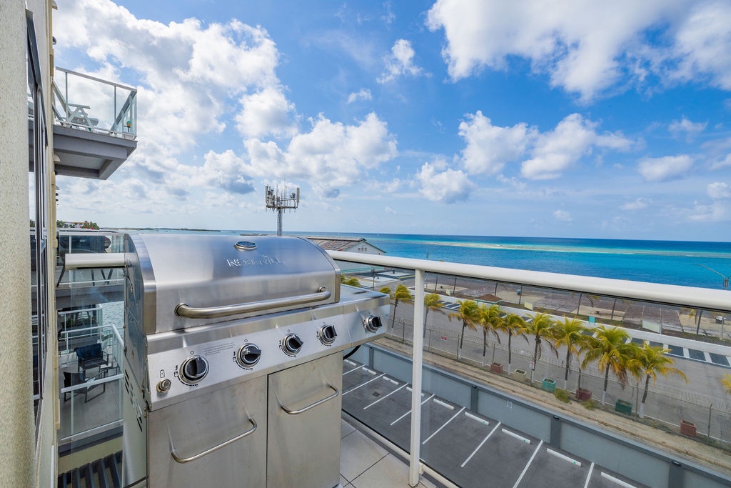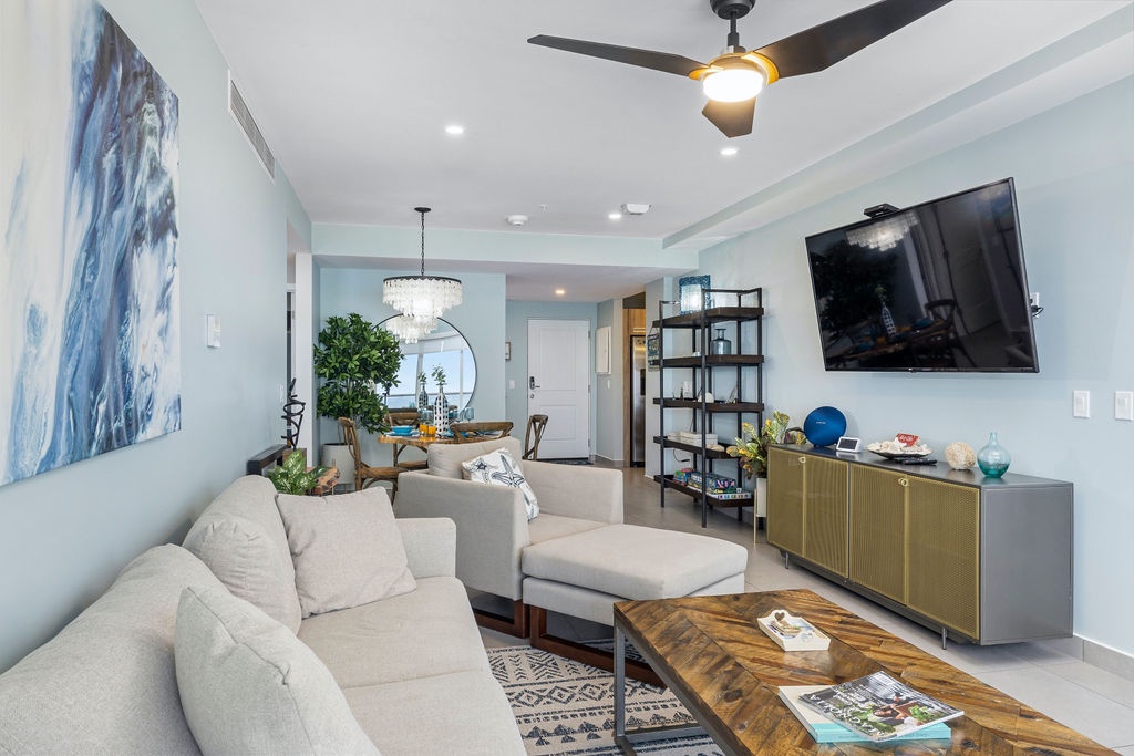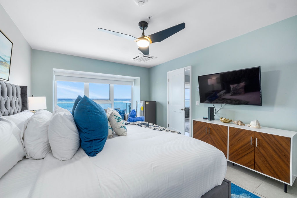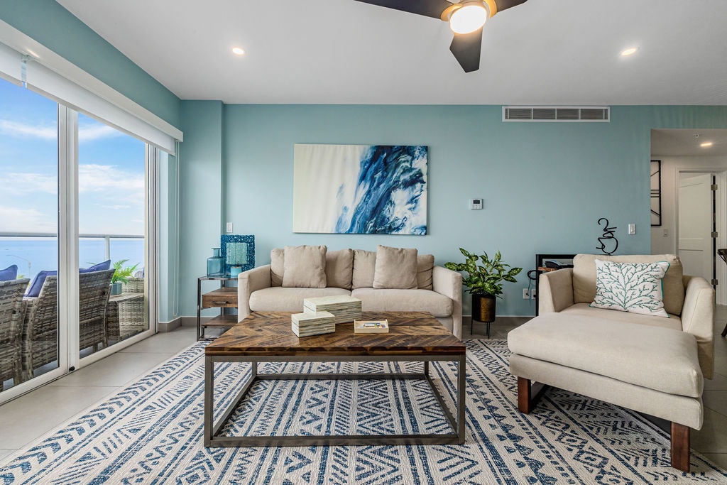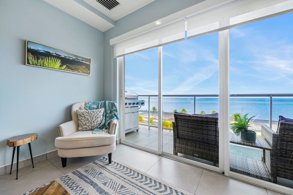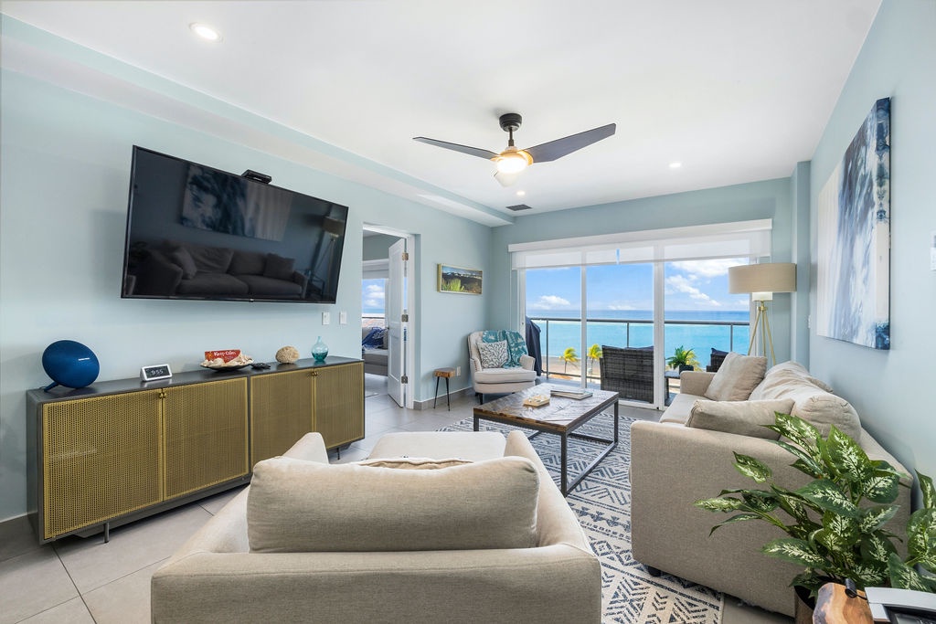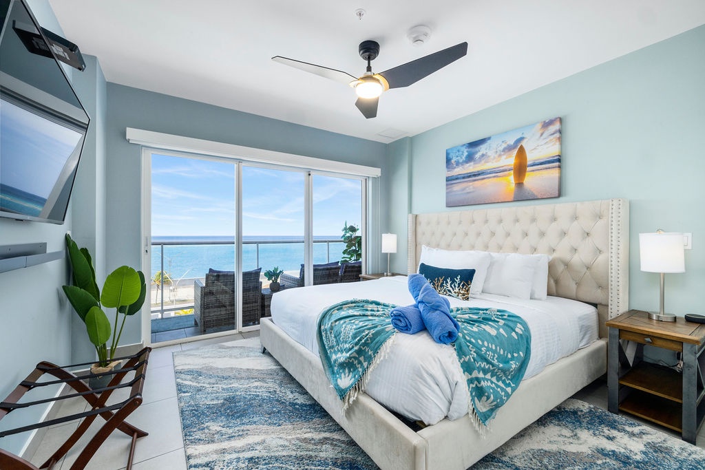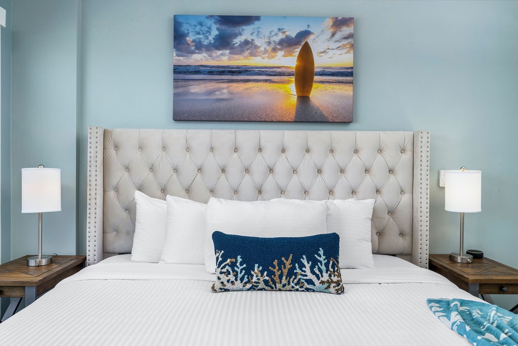 Ocean Breeze is a three-bedroom condo featuring 2 king-sized beds and one twin-sized bunk beds. Each bedroom has a 48” flat screen TV, luggage racks, closet space, and its own ensuite bathroom complete with luxury linens. The kitchen has beautiful custom lighting and tile work and is fully equipped with everything you need to enjoy meals in, including a blender, air fryer, toaster, and top-of-the-line Cuisinart coffee maker. There is also a new propane grill with tools on the large balcony. The living room, decorated with live-edge wood tables and beautiful artwork, features a 75” flat screen TV with every single IPTV channel, as well as Prime Video, Netflix, Hulu, and HBO Max. It is comfortably designed with plenty of seating for evening lounging and, if you prefer, the 110 sq ft balcony has a total of six chairs with ottomans and side tables to enjoy the beautiful ocean views with your morning coffee. The entire condo comes equipped with WIFI, central A/C controlled by thermostats for maximum comfort, remote ceiling fans in the living room and bedrooms, portable oscillating fan, guest safe in each bedroom closet for valuables, hair dryers and clothes steamer, washer and dryer, smart outlets, Alexa shows and echo dots (just ask Alexa to play music, for restaurant info, weather reports, or sports scores!) as well as a portable Bluetooth speaker for music on the balcony!