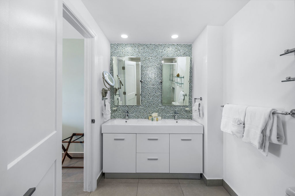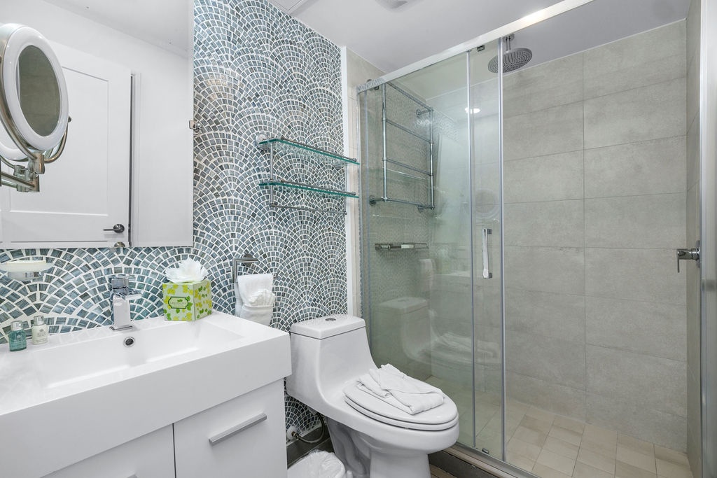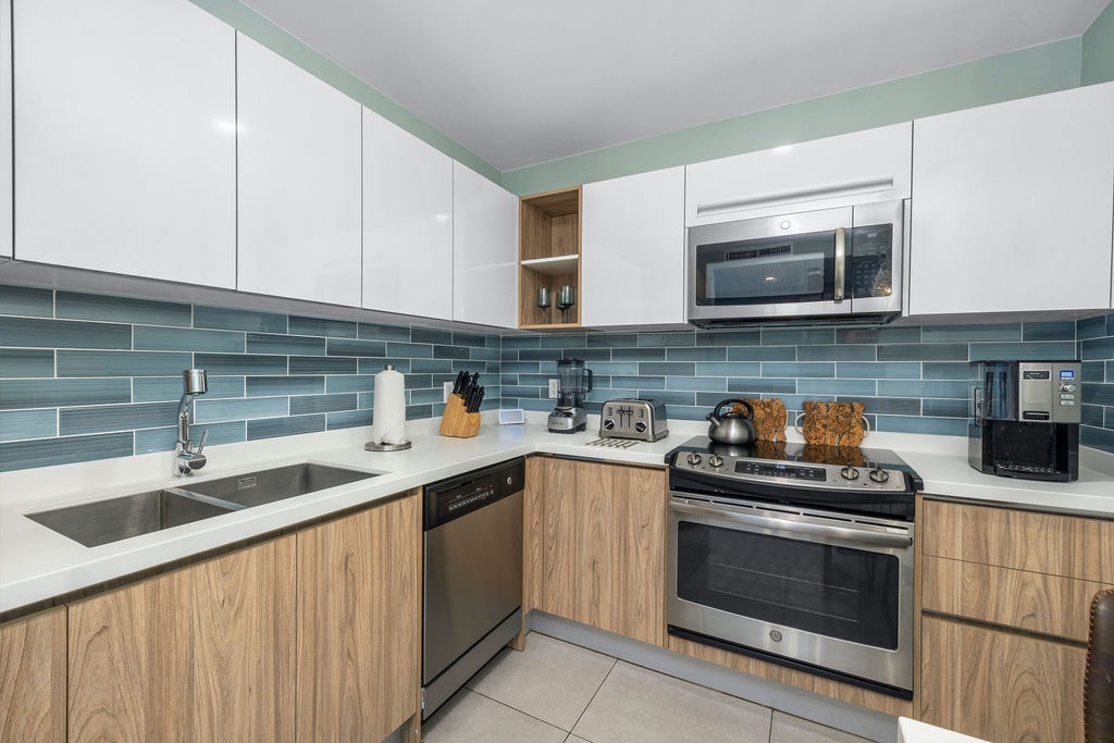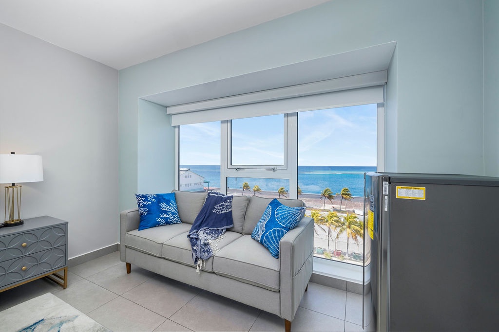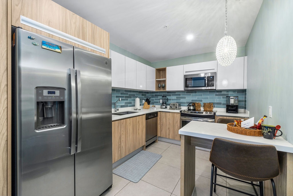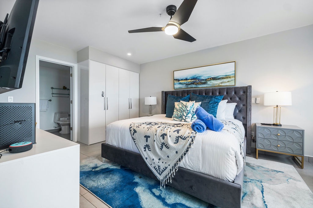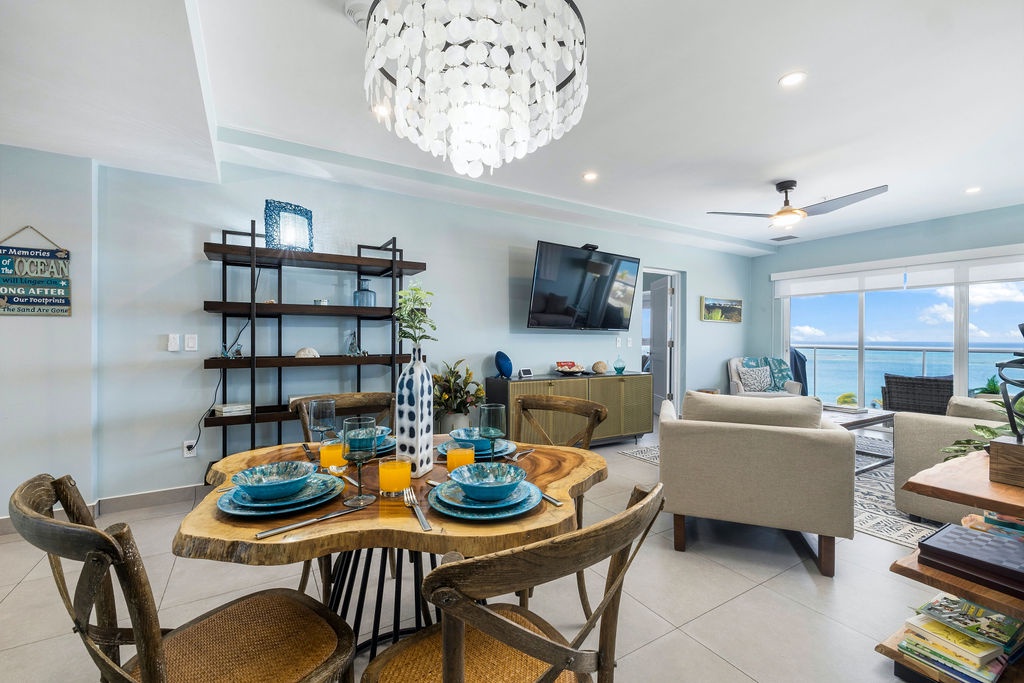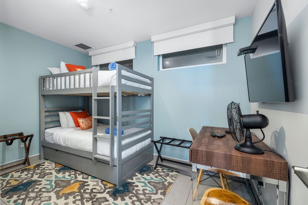Ocean Breeze is a three-bedroom condo featuring 2 king-sized beds and one twin-sized bunk beds. Each bedroom has a 48” flat screen TV, luggage racks, closet space, and its own ensuite bathroom complete with luxury linens. The kitchen has beautiful custom lighting and tile work and is fully equipped with everything you need to enjoy meals in, including a blender, air fryer, toaster, and top-of-the-line Cuisinart coffee maker. There is also a new propane grill with tools on the large balcony. The living room, decorated with live-edge wood tables and beautiful artwork, features a 75” flat screen TV with every single IPTV channel, as well as Prime Video, Netflix, Hulu, and HBO Max. It is comfortably designed with plenty of seating for evening lounging and, if you prefer, the 110 sq ft balcony has a total of six chairs with ottomans and side tables to enjoy the beautiful ocean views with your morning coffee. The entire condo comes equipped with WIFI, central A/C controlled by thermostats for maximum comfort, remote ceiling fans in the living room and bedrooms, portable oscillating fan, guest safe in each bedroom closet for valuables, hair dryers and clothes steamer, washer and dryer, smart outlets, Alexa shows and echo dots (just ask Alexa to play music, for restaurant info, weather reports, or sports scores!) as well as a portable Bluetooth speaker for music on the balcony!