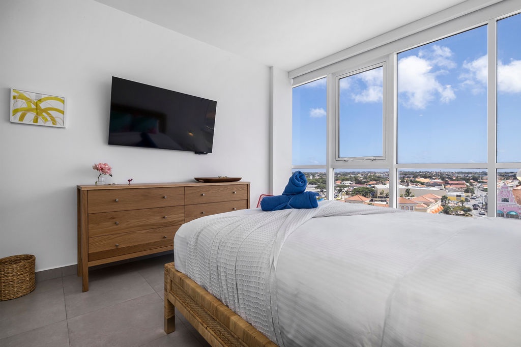 • A stunning infinity pool overlooking the Oranjestad Marina with tropical deck create a relaxing environment at the center of the complex with poolside lounges and umbrellas from 8:00 am to 9:00 pm and a bar that serves drinks and snacks all day.
