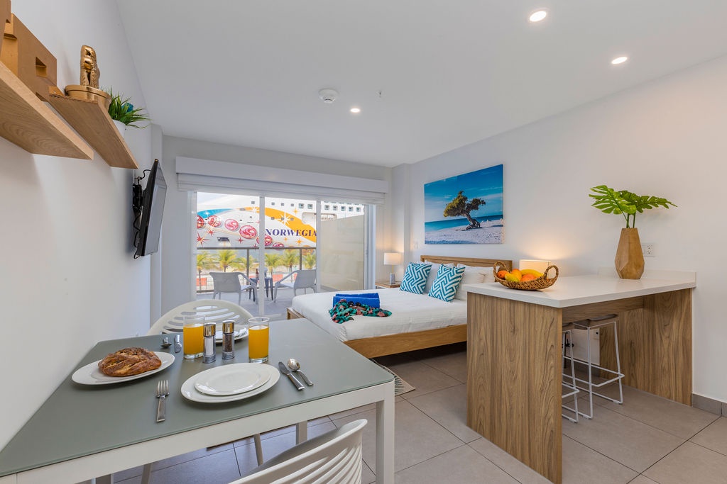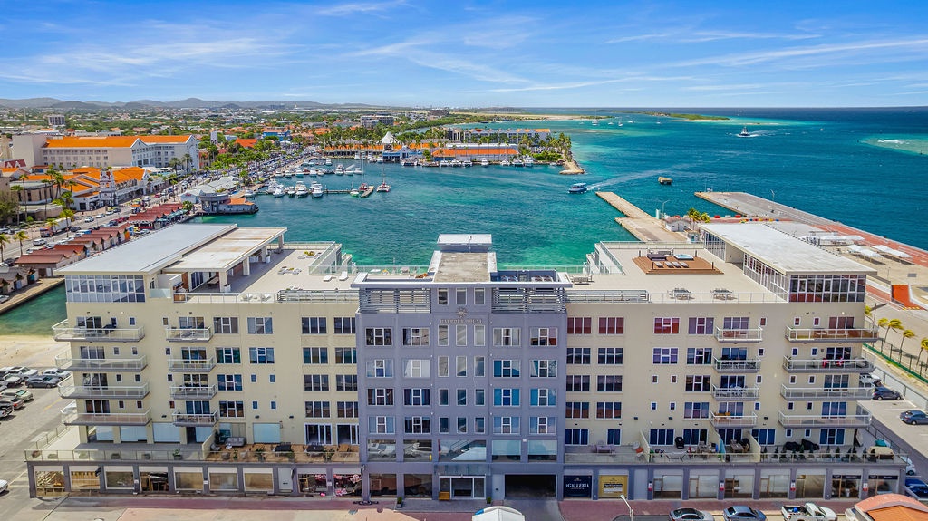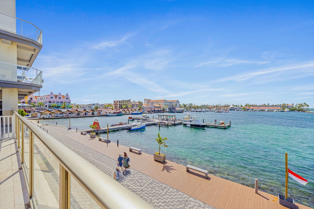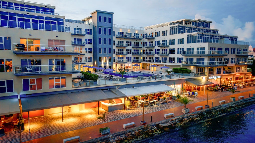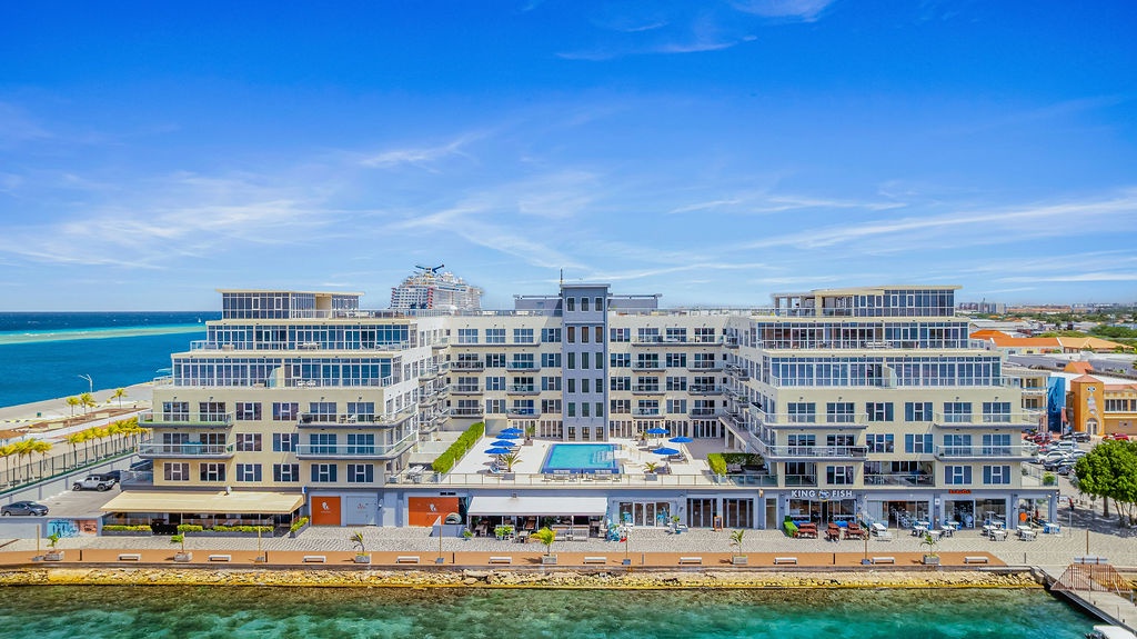 • A stunning infinity pool overlooking the Oranjestad Marina wit tropical deck create a relaxing environment at the center of the complex with poolside lounges and umbrellas from 8:00 am to 9:00 pm.