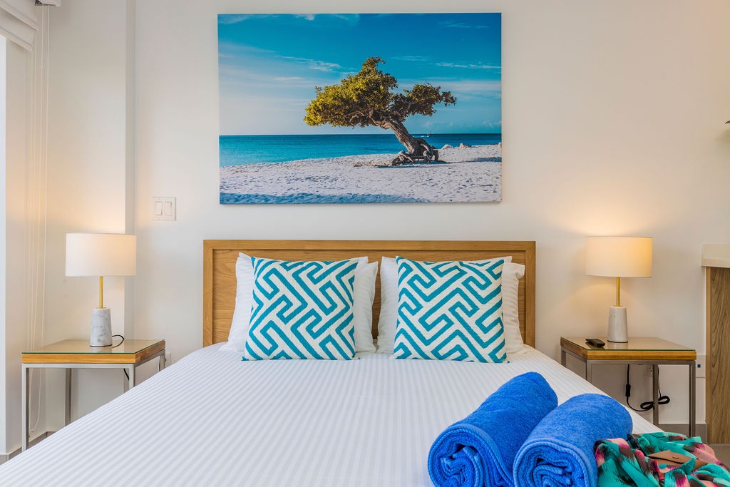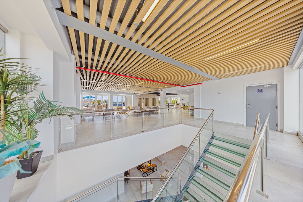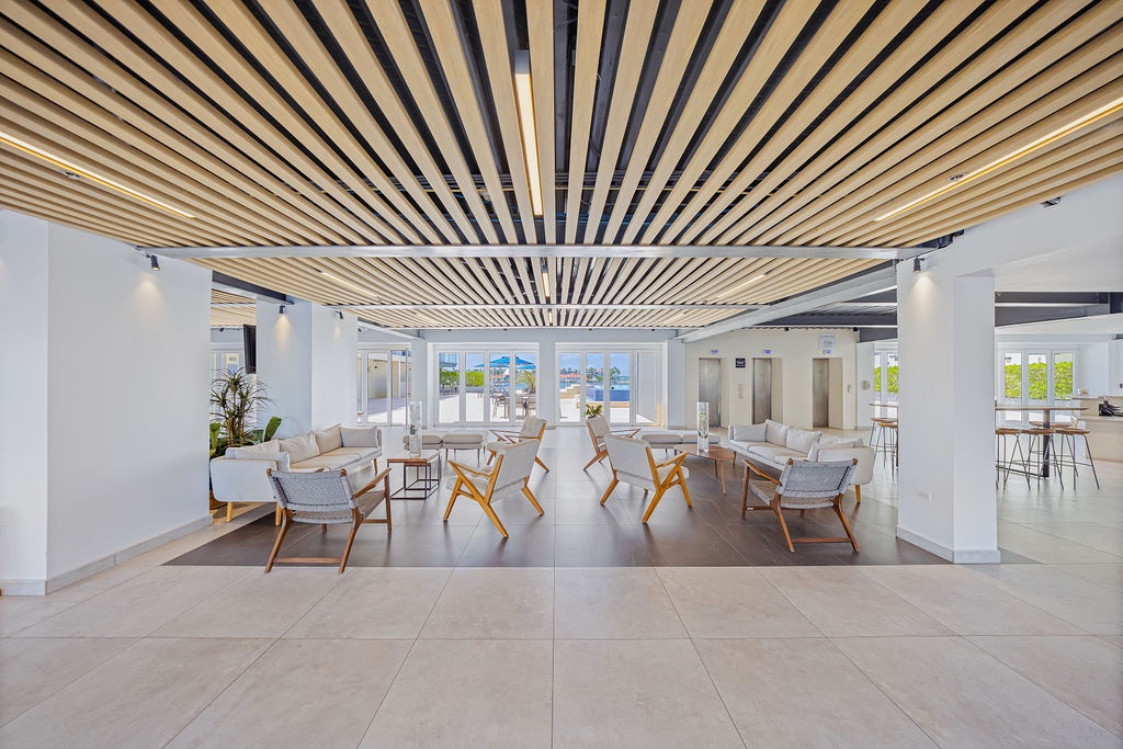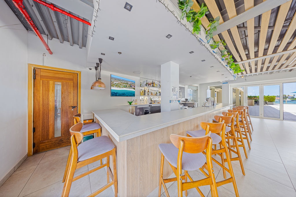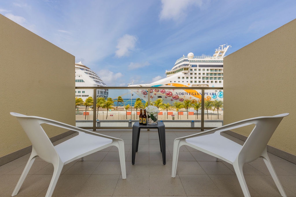 • A stunning infinity pool overlooking the Oranjestad Marina wit tropical deck create a relaxing environment at the center of the complex with poolside lounges and umbrellas from 8:00 am to 9:00 pm.