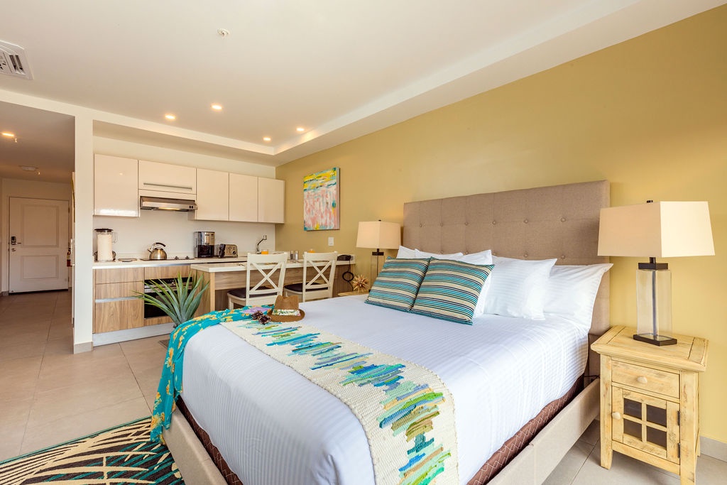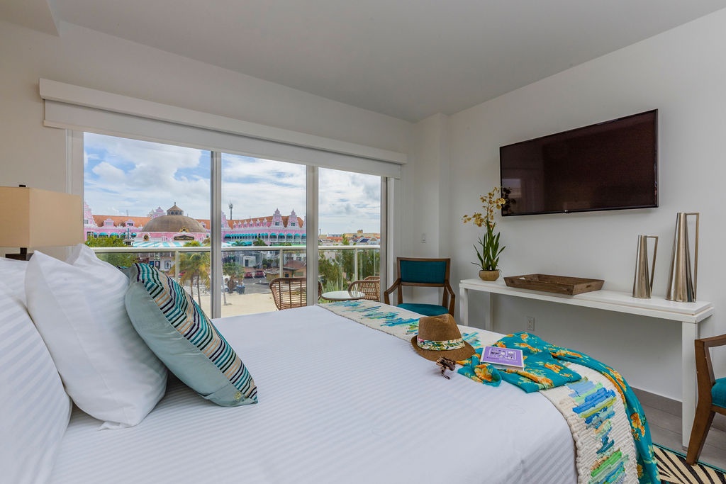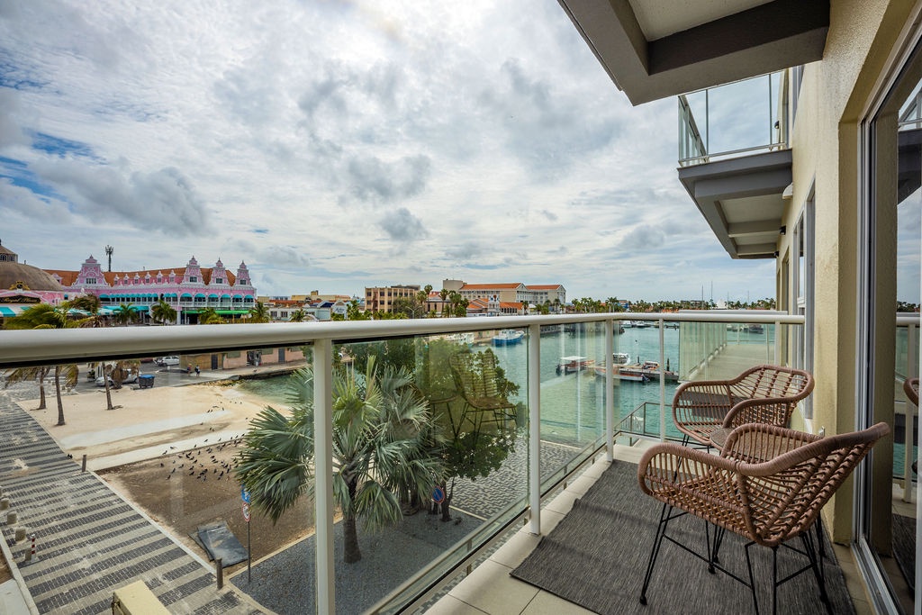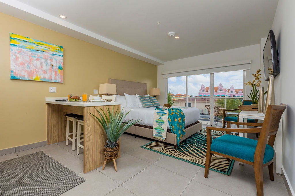 • A stunning infinity pool overlooking the Oranjestad Marina wit tropical deck create a relaxing environment at the center of the complex with poolside lounges and umbrellas from 8:00 am to 9:00 pm.