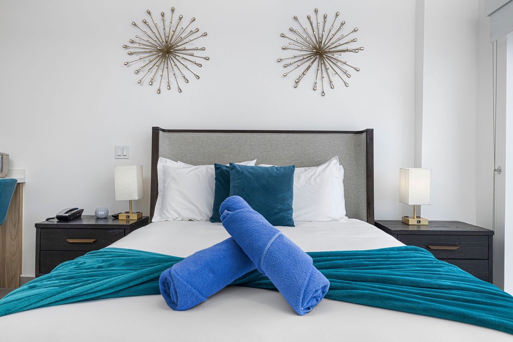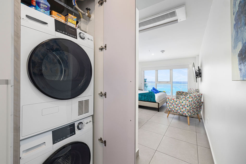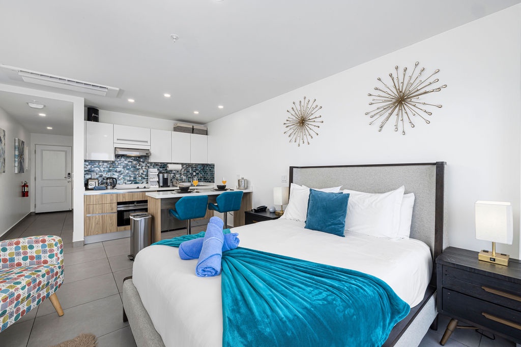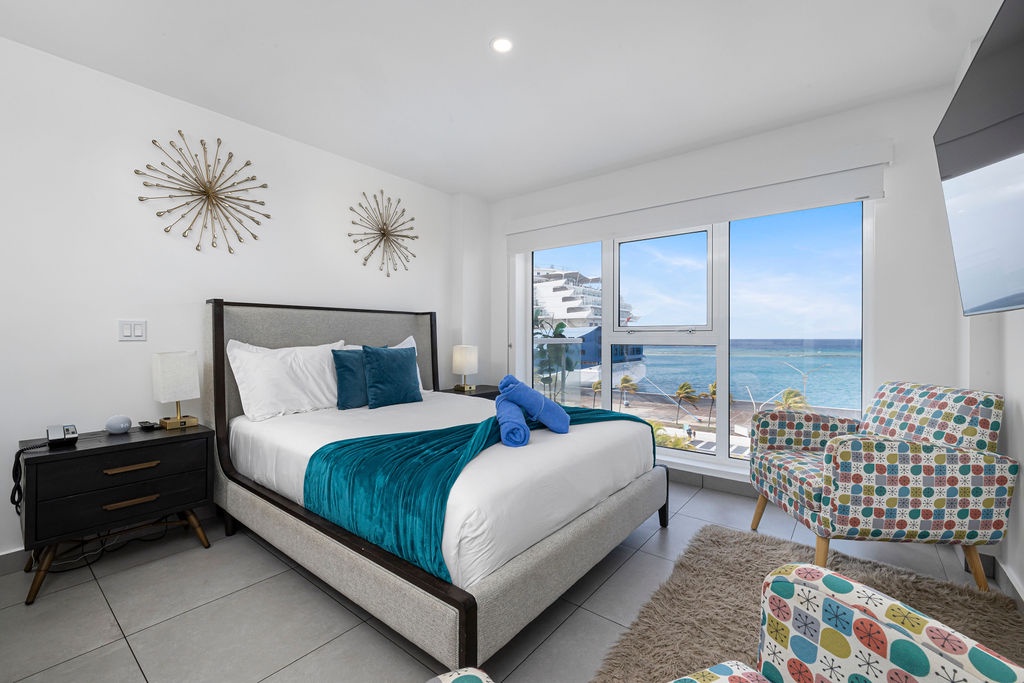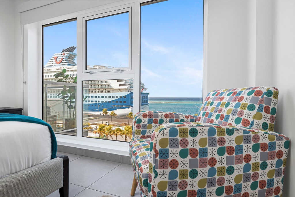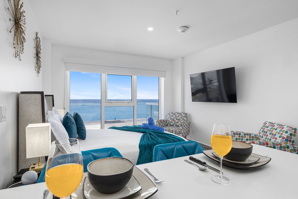 Amazing Ocean views from the comfort of your own bed. Enjoy seeing cruises arrive in front of you! This air-conditioned studio features One King bed, one bathroom with shower, hairdryer, and an equipped kitchen. Washer and dryer in the unit. Free Wi-Fi and Cable TV.
