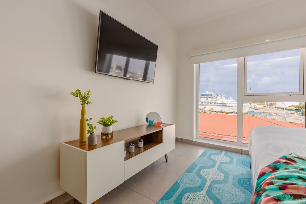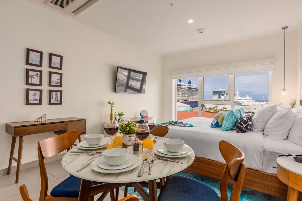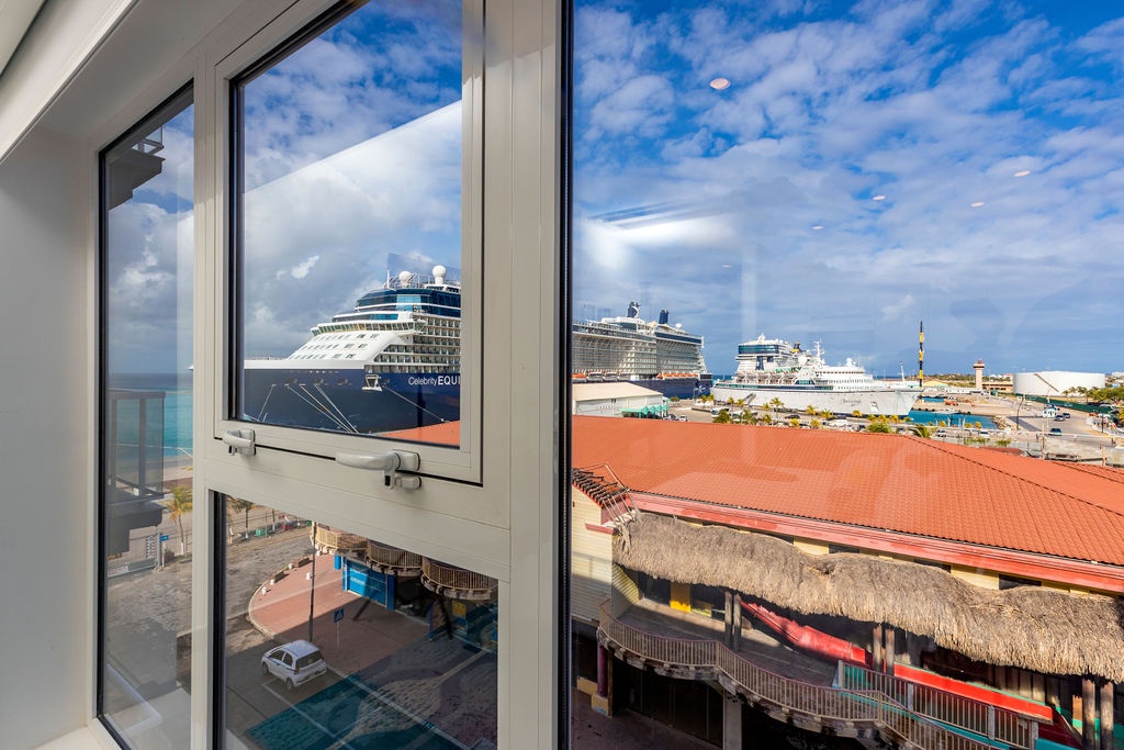• A stunning infinity pool overlooking the Oranjestad Marina with tropical deck that creates a relaxing environment at the center of the complex with poolside lounges and umbrellas open from 8:00 am to 9:00 pm.
