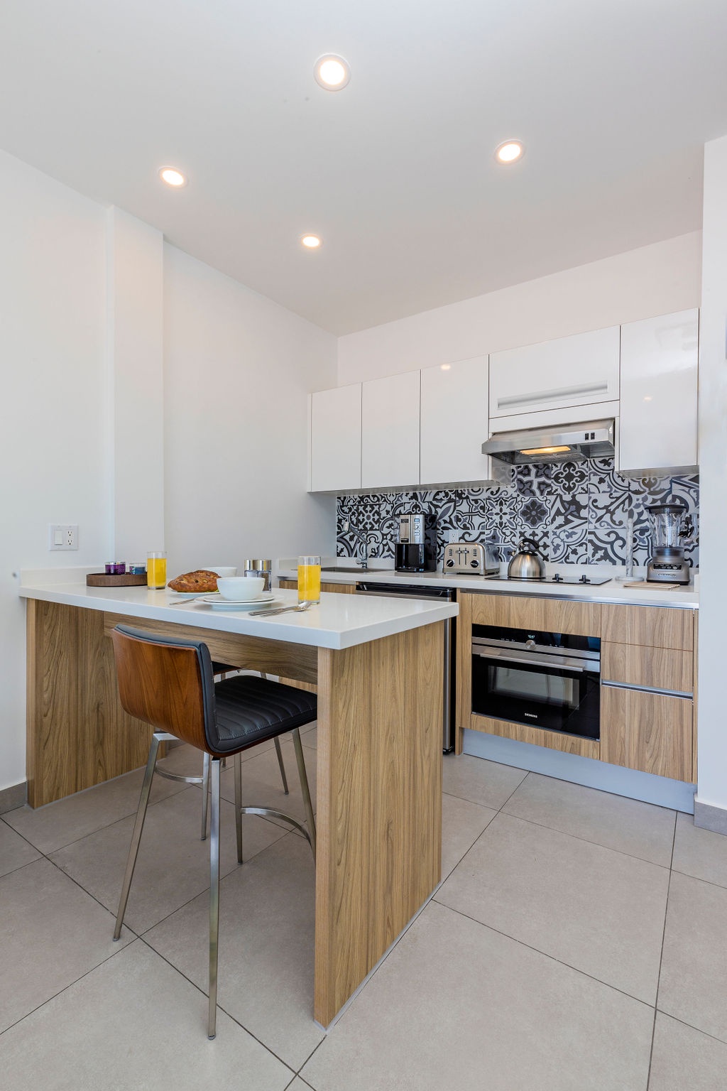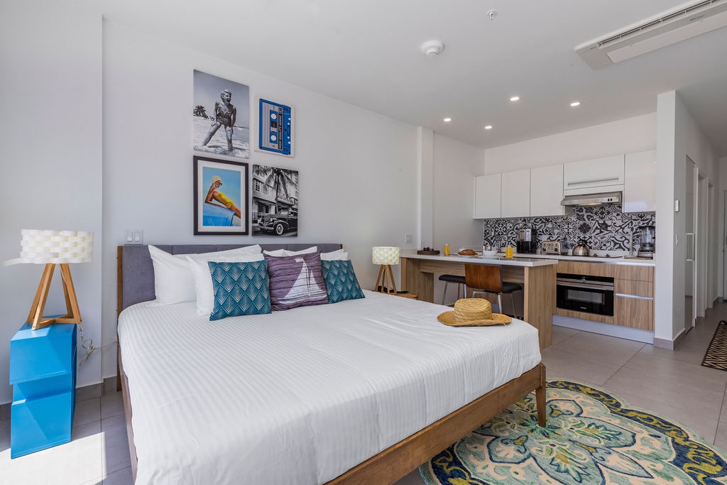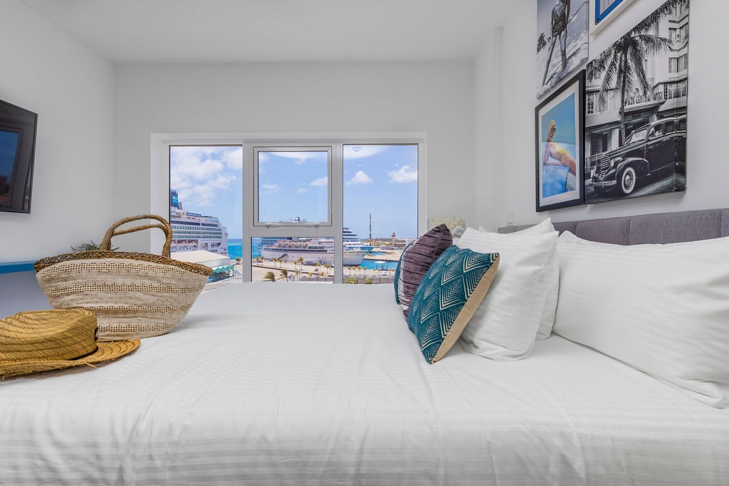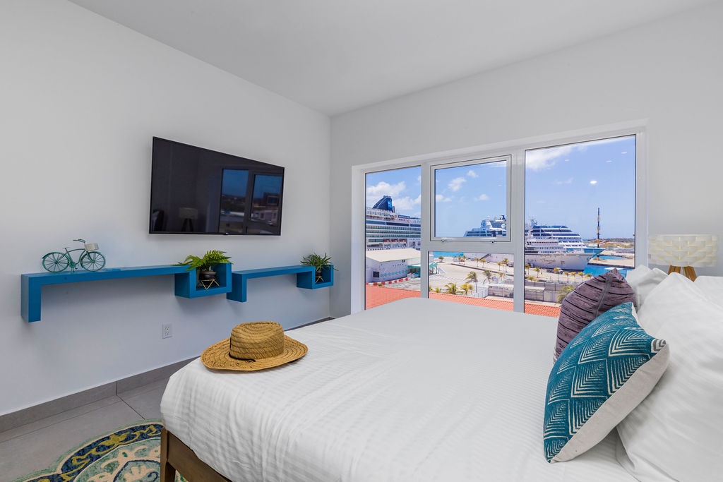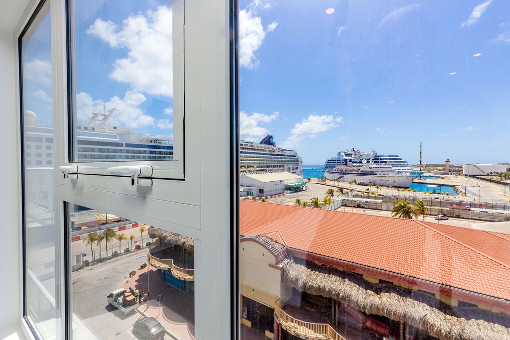 • A stunning infinity pool overlooking the Oranjestad Marina wit tropical deck create a relaxing environment at the center of the complex with poolside lounges and umbrellas from 8:00 am to 9:00 pm.