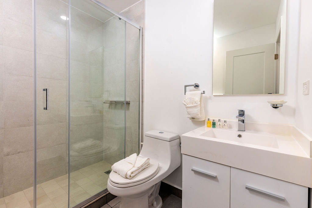 • Bathroom has their own white towels and blue beach towels in the vanity.