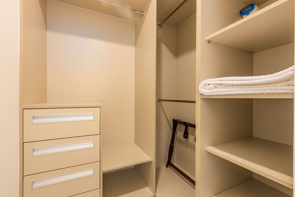 • Bathroom has their own white towels and blue beach towels in the vanity.