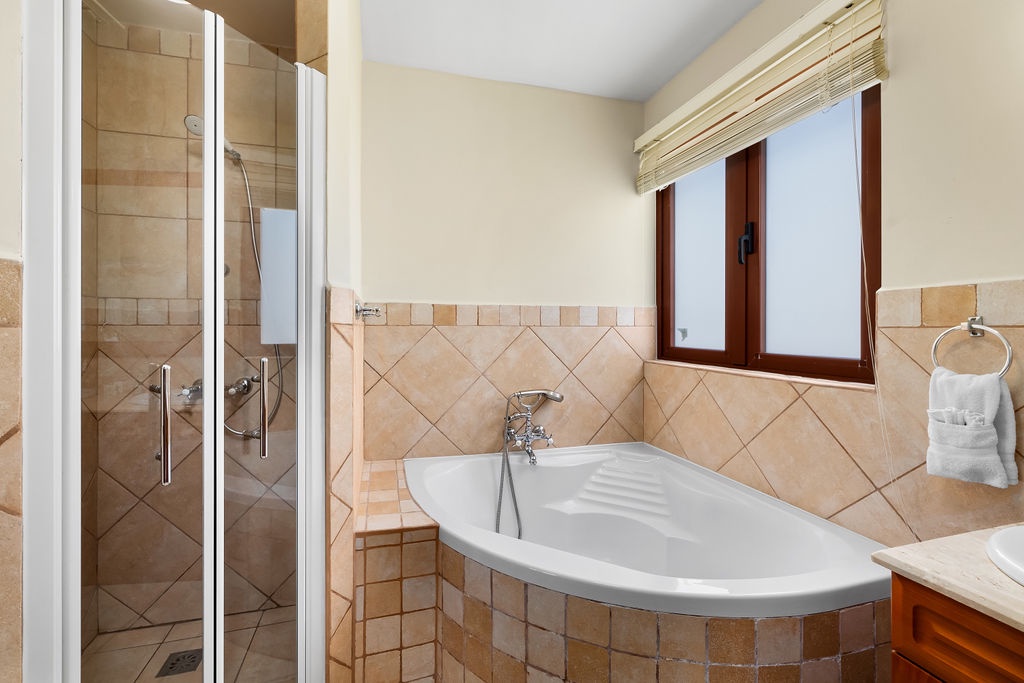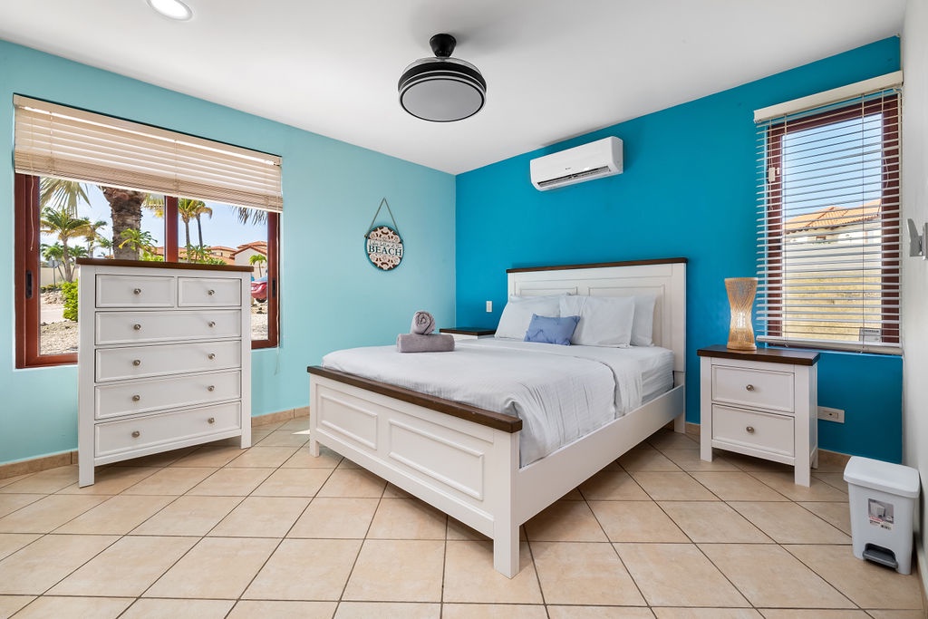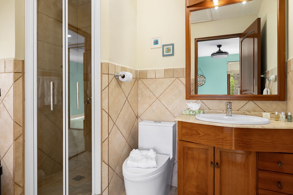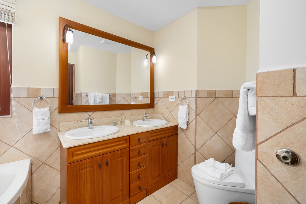This villa offers two bedrooms, each designed for a restful stay. The master suite features a king-size bed, and an ensuite bathroom with a walk-in shower, spa and dual vanity. The second bedroom is furnished with a queen-size bed and has its own ensuite bathroom with a walk-in shower. An additional half-bathroom is conveniently located in the main living area.