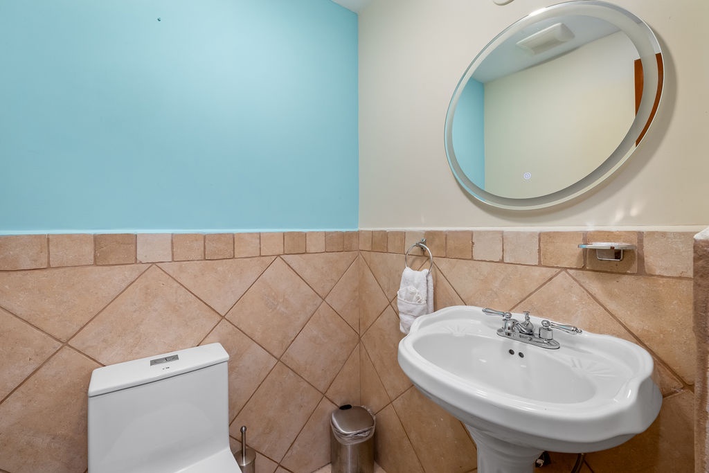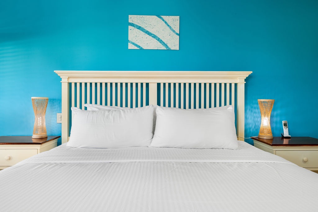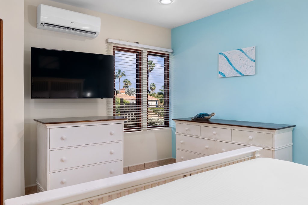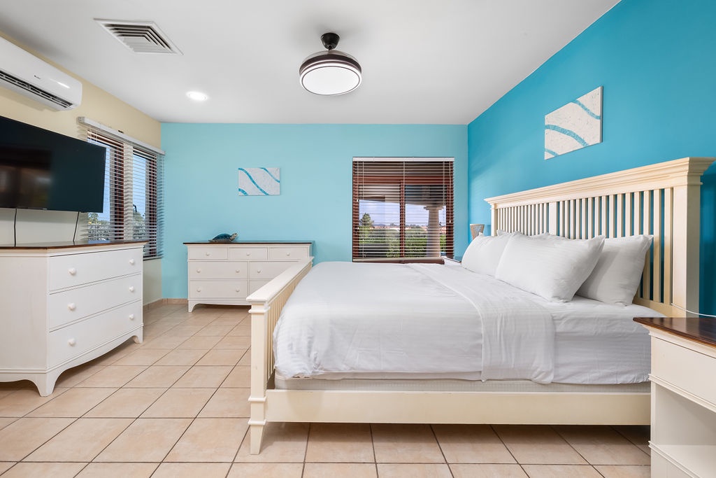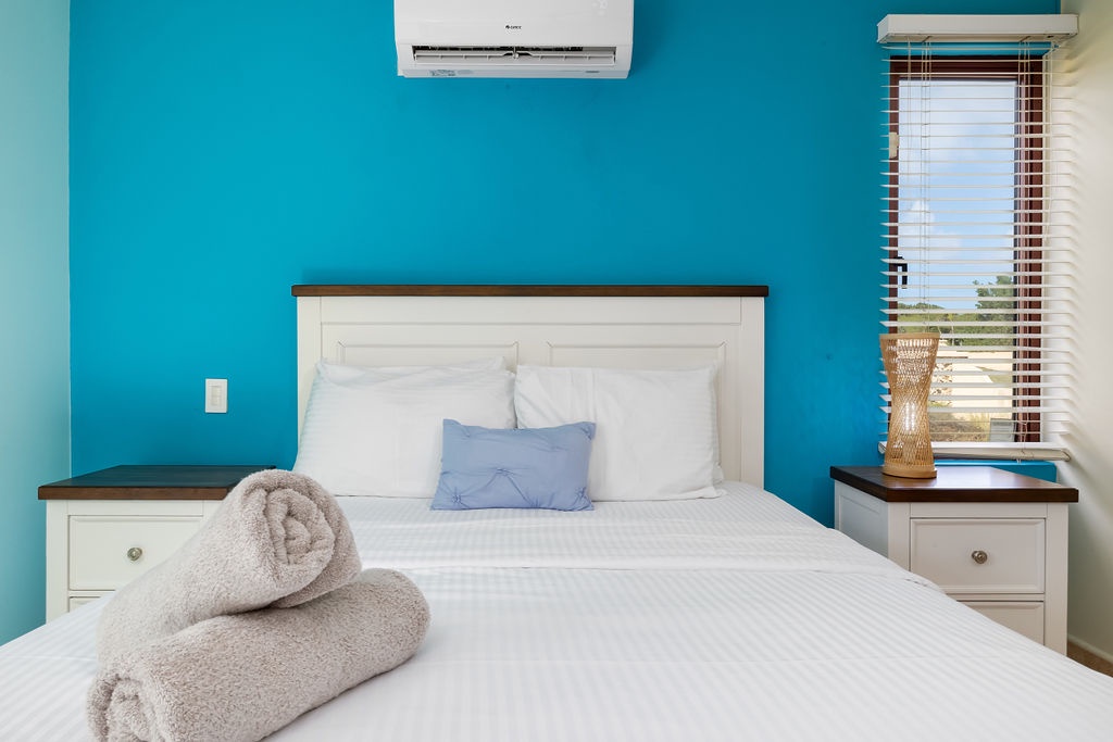 This villa offers two bedrooms, each designed for a restful stay. The master suite features a king-size bed, and an ensuite bathroom with a walk-in shower, spa and dual vanity. The second bedroom is furnished with a queen-size bed and has its own ensuite bathroom with a walk-in shower. An additional half-bathroom is conveniently located in the main living area.