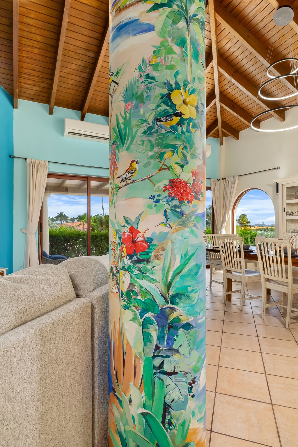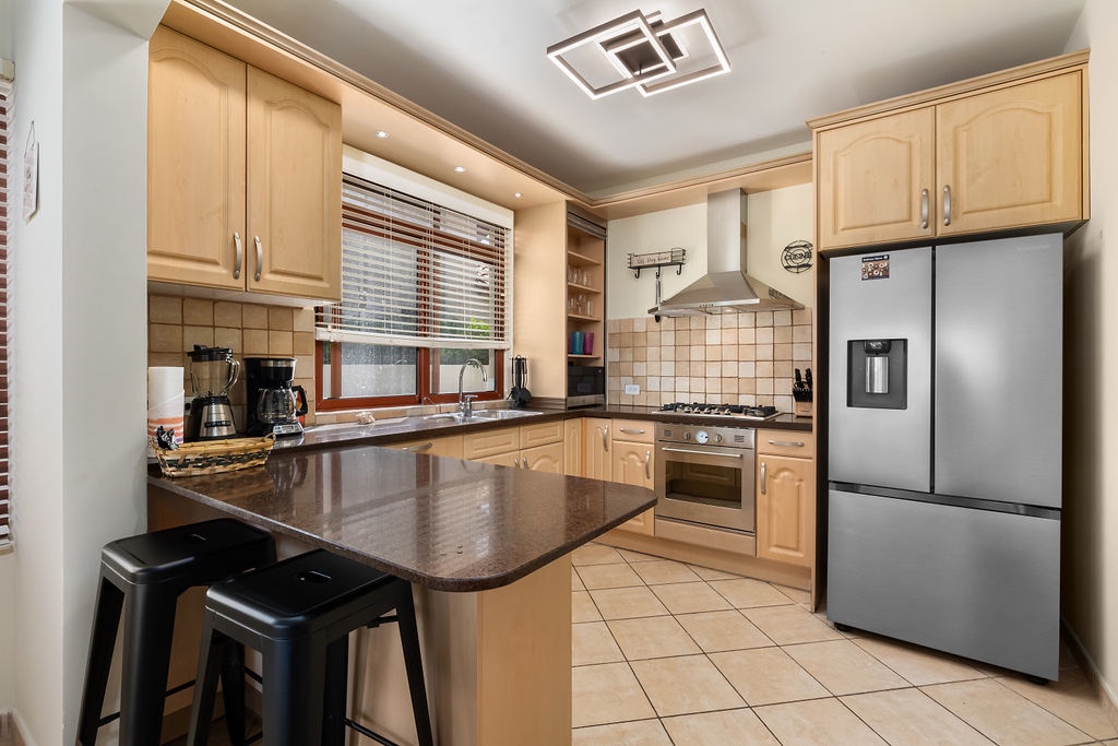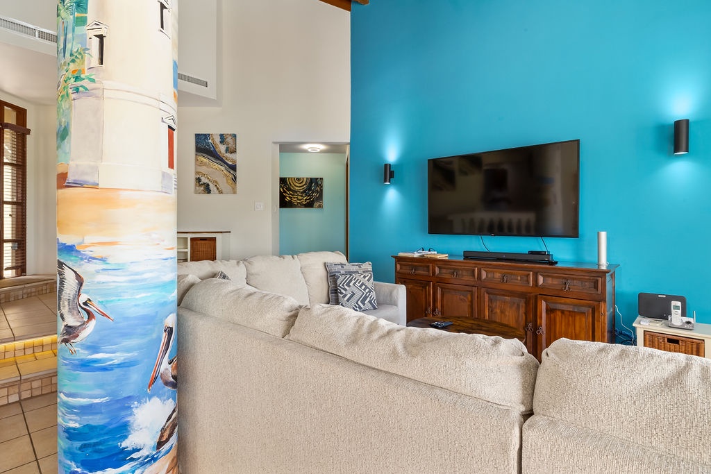 The inviting open-concept living space has high ceilings and large windows that fill the room with natural light. Featuring a super comfortable L-shaped sofa, a Smart TV, and a dining table for six. The fully equipped kitchen includes high-end appliances, cookware, and utensils, making it easy to prepare anything from a quick breakfast to a gourmet meal. A washer and dryer are also available for added convenience.