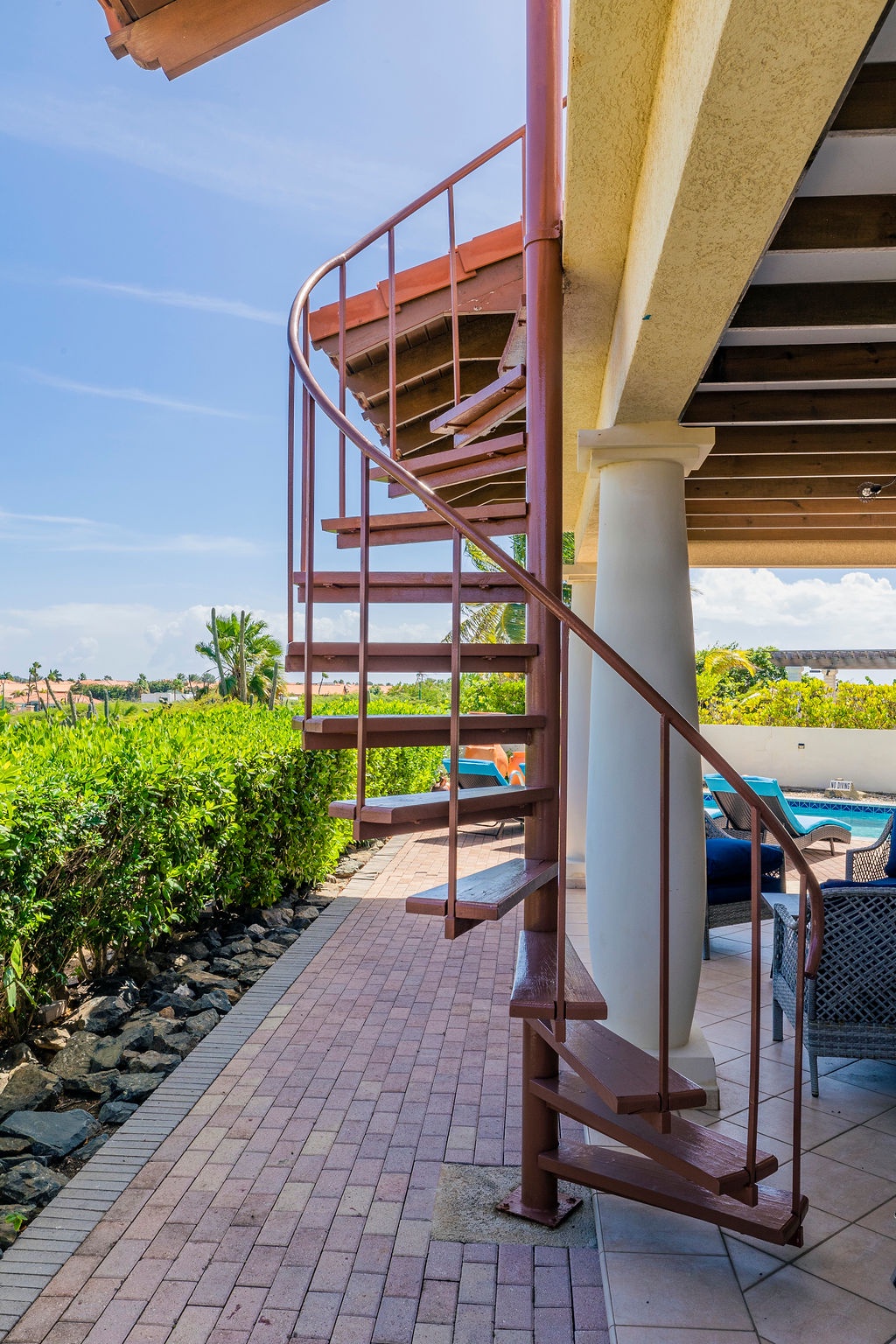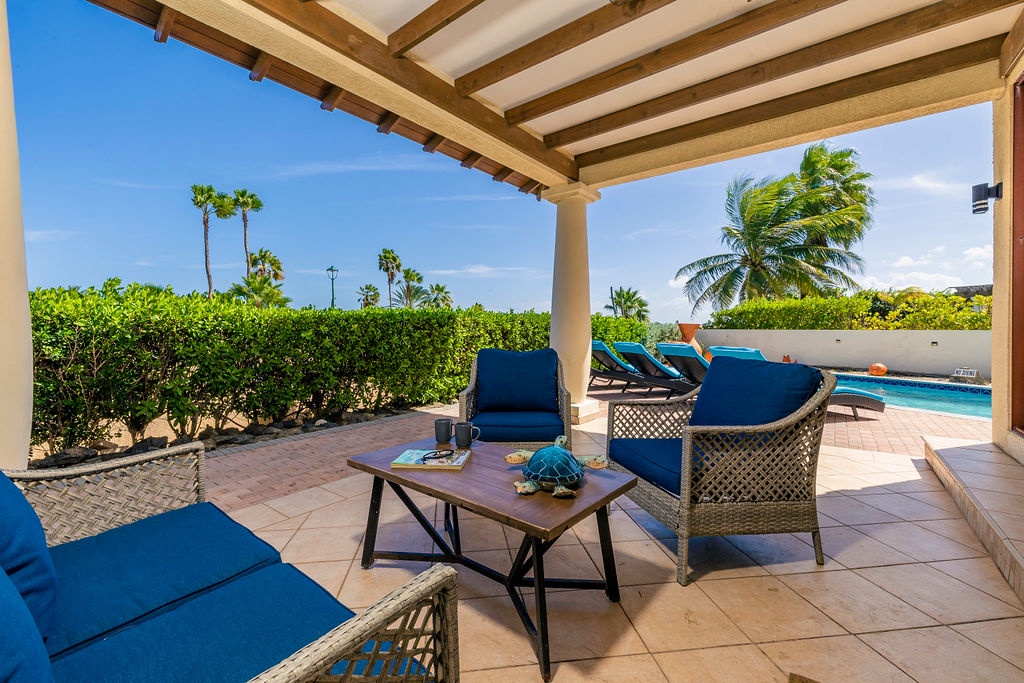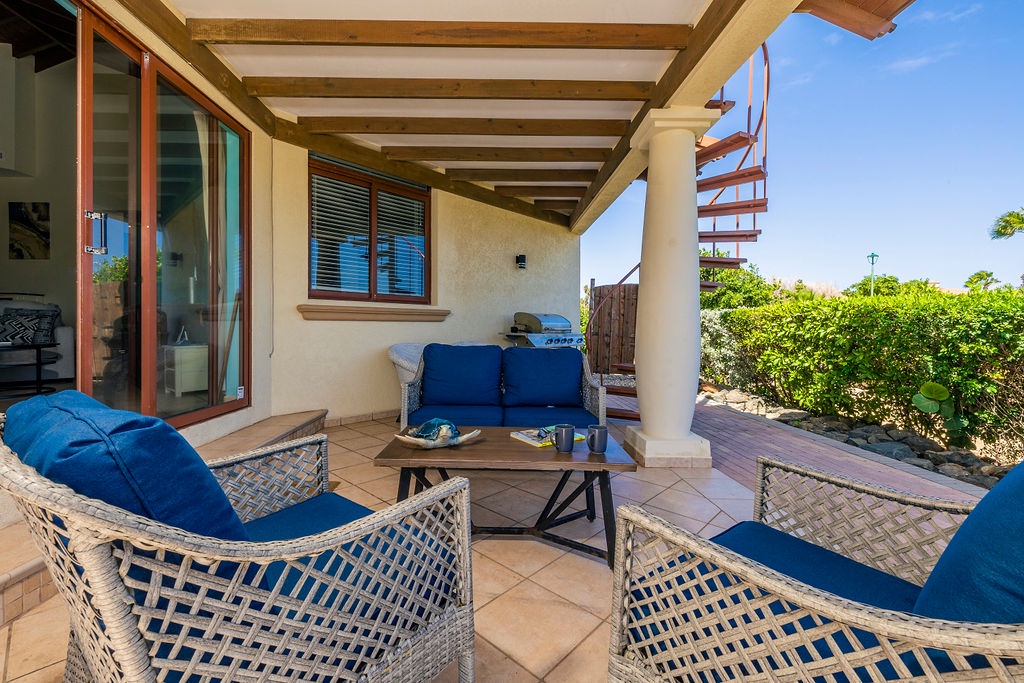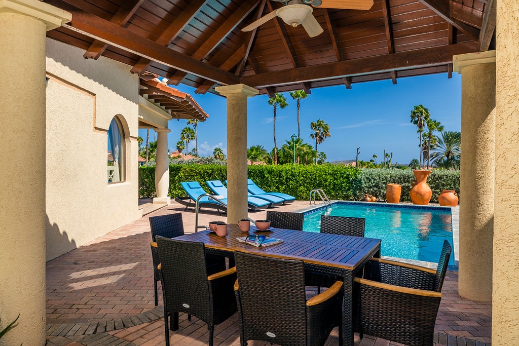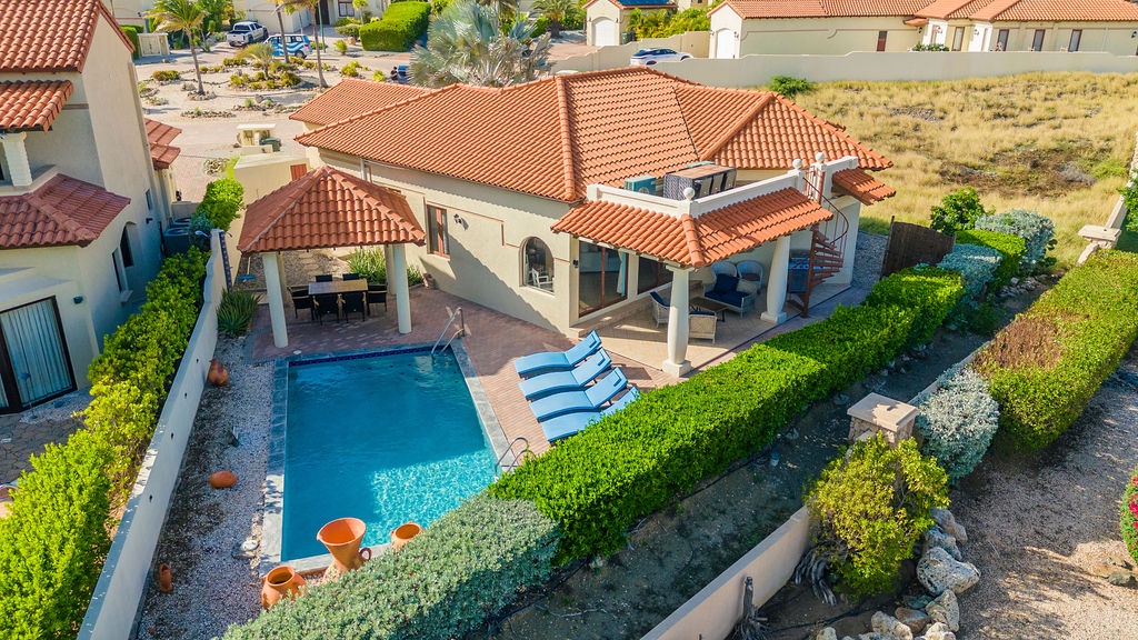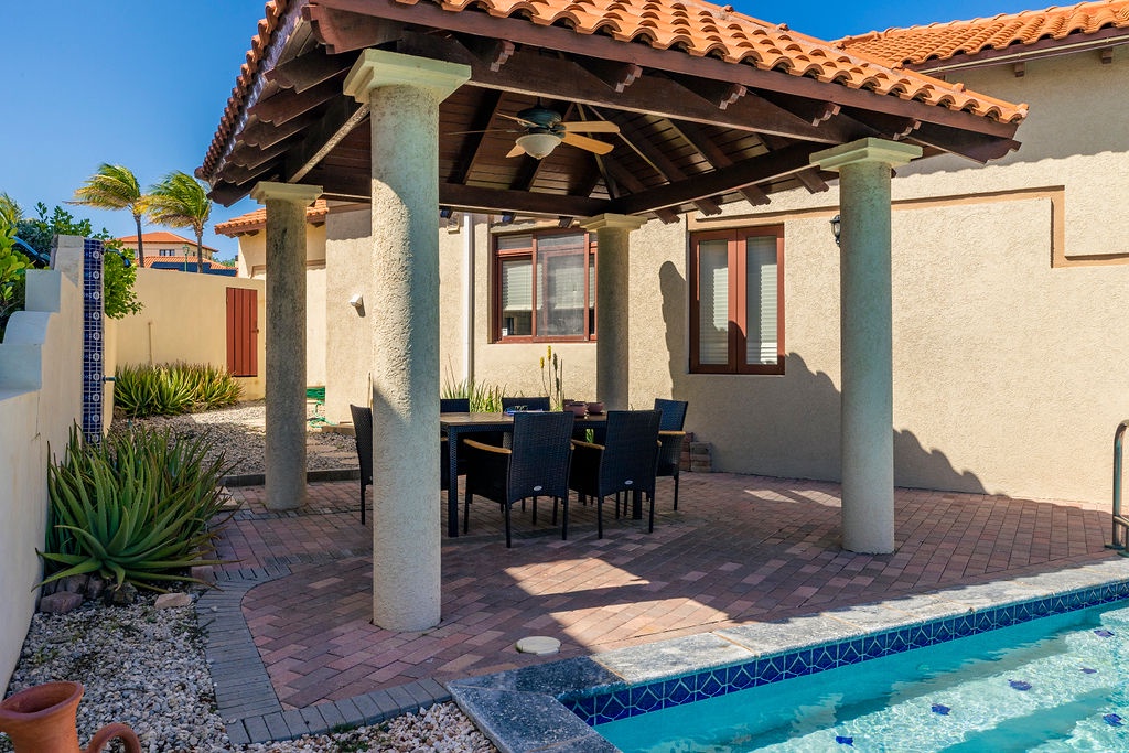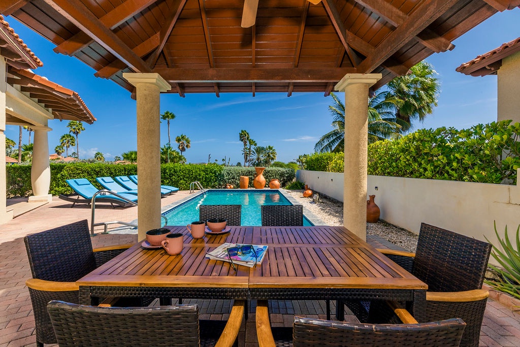 Step outside to your own tropical retreat, where a gazebo with a dining table provides the perfect setting for alfresco meals. A lounge area with comfortable seating invites you to unwind, while the BBQ grill is ideal for hosting island-style cookouts. The private swimming pool, surrounded by lush greenery, offers a serene escape to relax and soak up the sun.