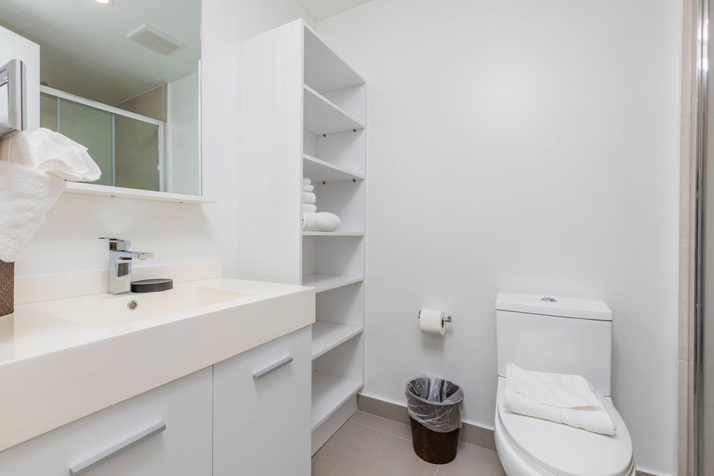 • Bathroom has their own white towels and blue beach towels in the vanity.