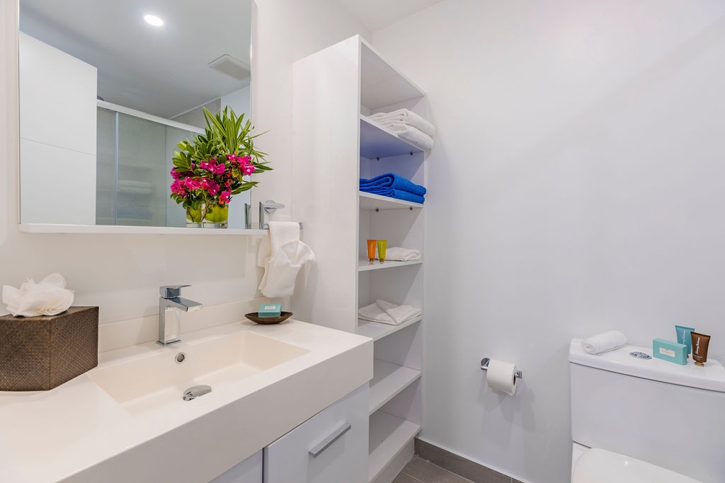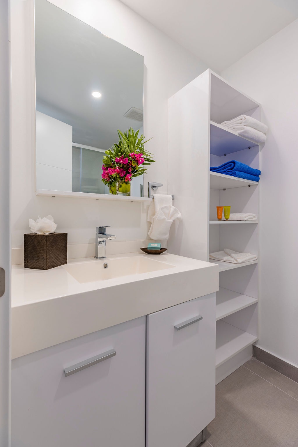 • Bathroom has their own white towels and blue beach towels in the vanity.