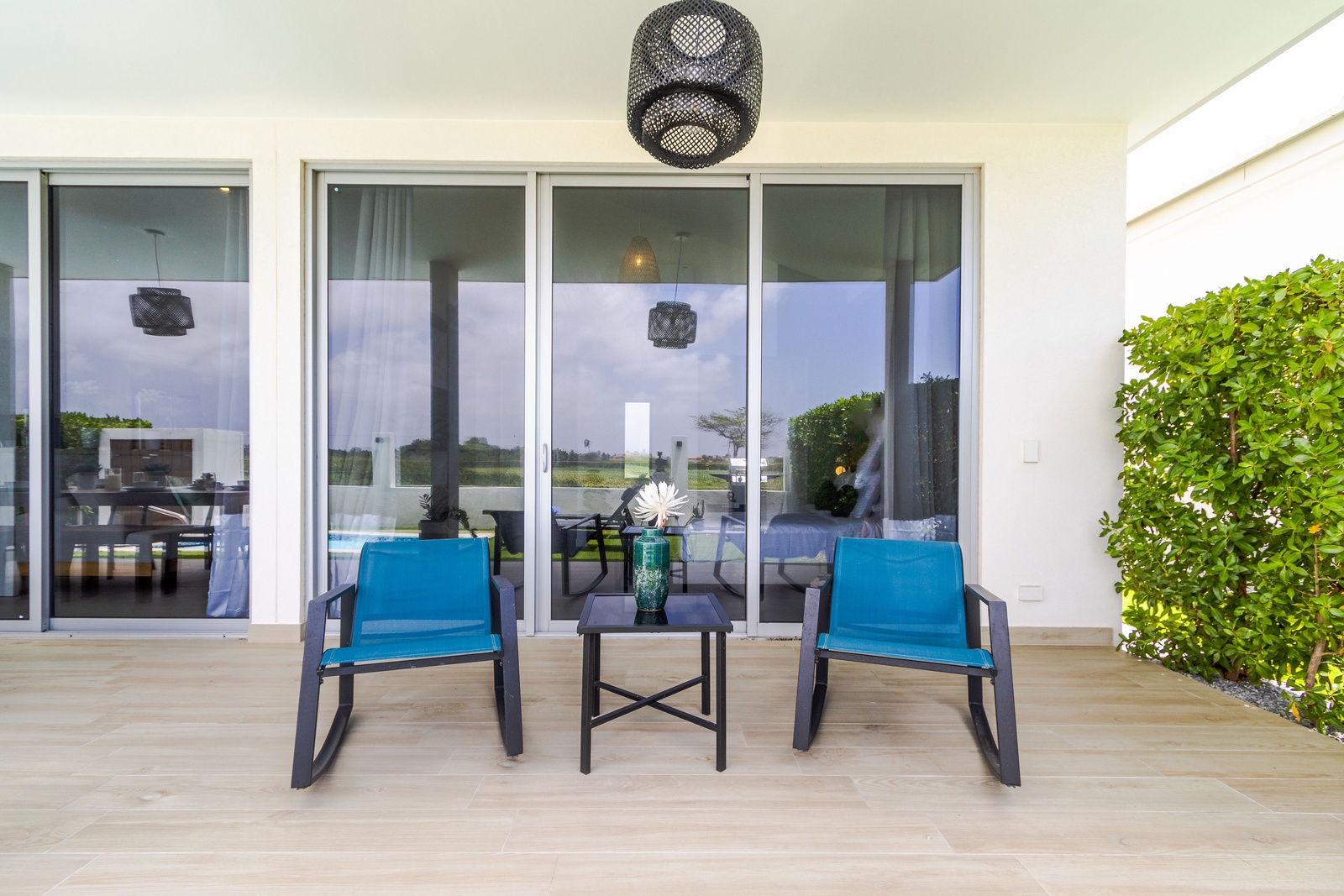 Beyond your private retreat, enjoy the shared amenities of the Azure Beach Residences, including two infinity pools with sun decks, a fitness center with ocean views, a tennis court, and on-site restaurants. The lobby lounge, with its modern tropical furnishings, provides a chic space to relax with a good book.