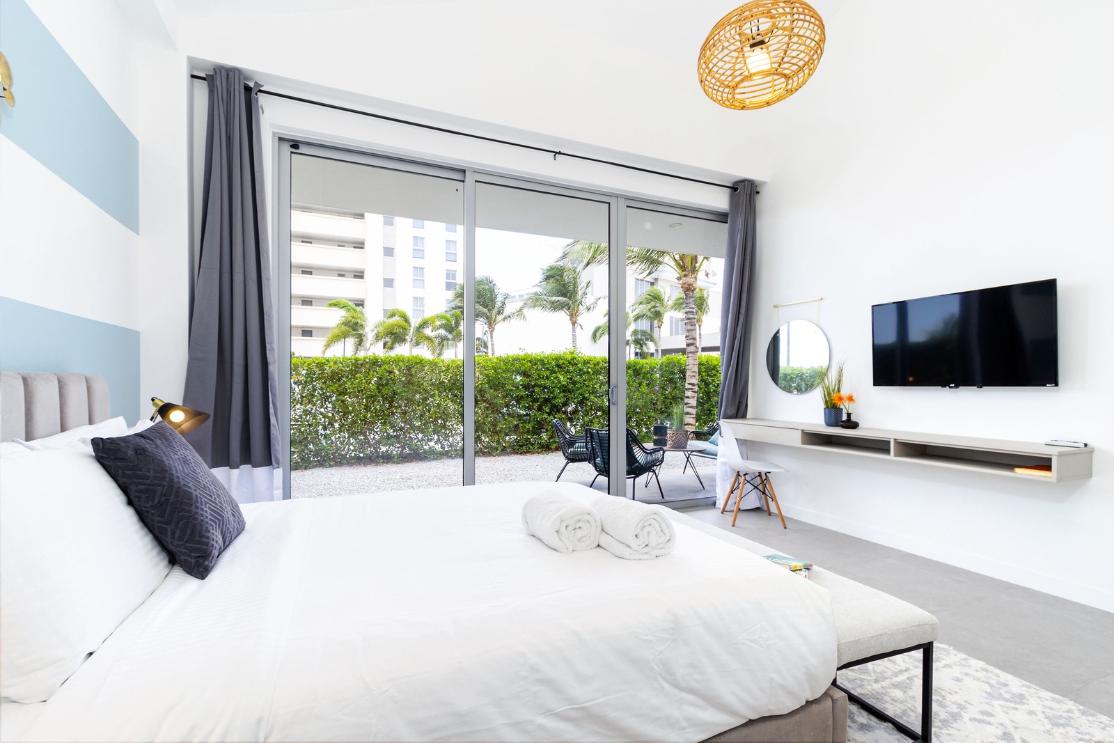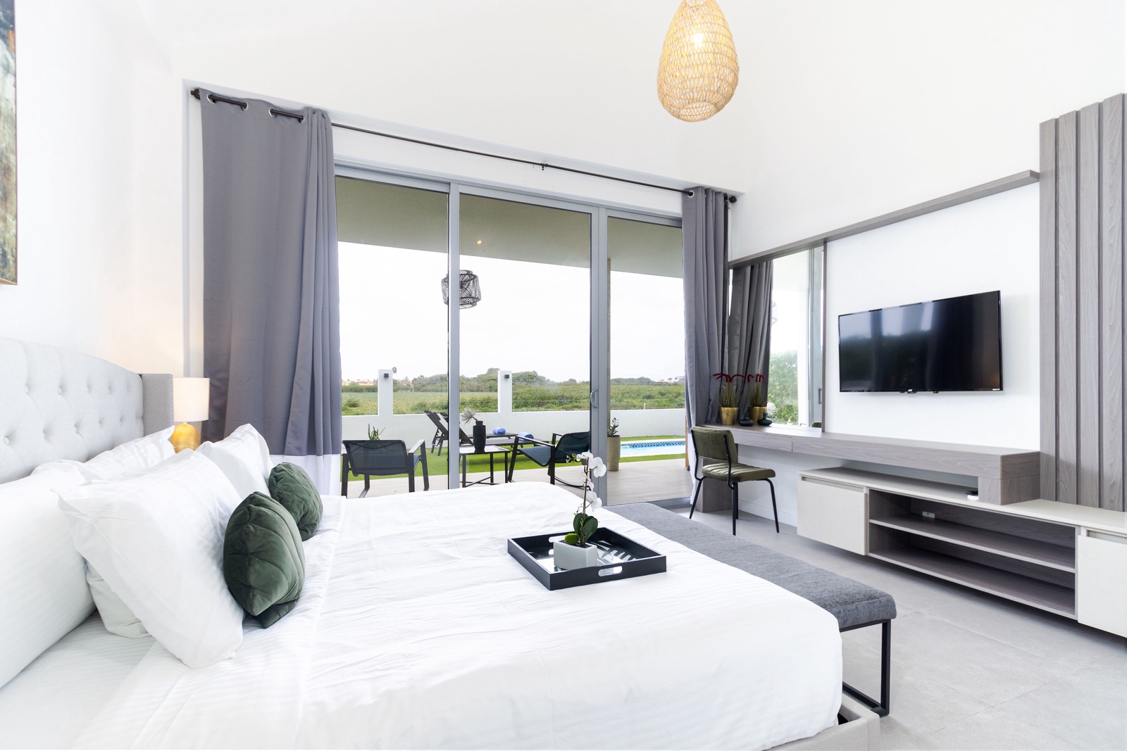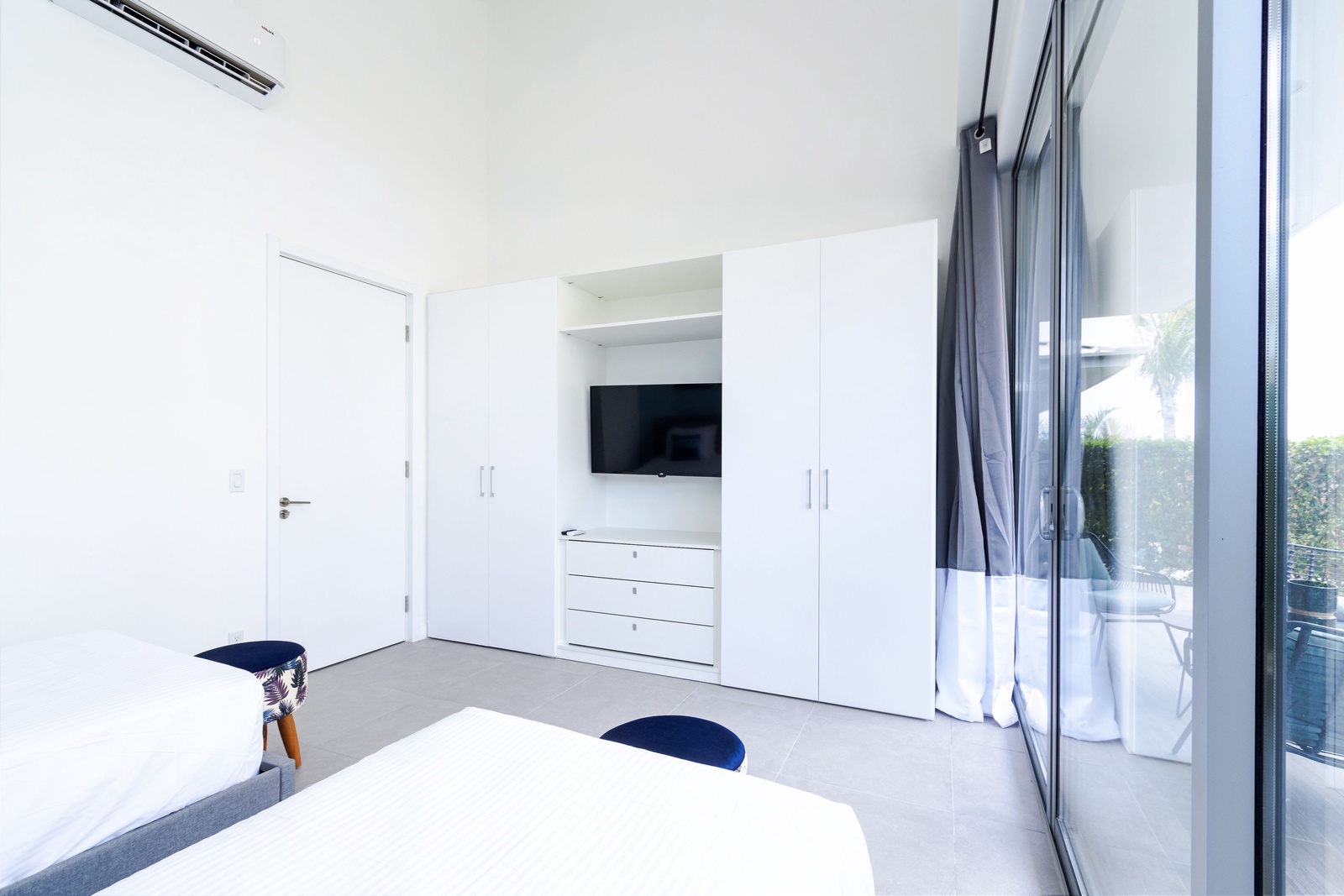 Each of the three bedrooms offers direct access to a balcony through sliding glass doors, where you’ll find comfortable lounge seating. Enjoy restful nights on luxurious mattresses with sumptuous bedding, and stay entertained with smart TVs in every room.