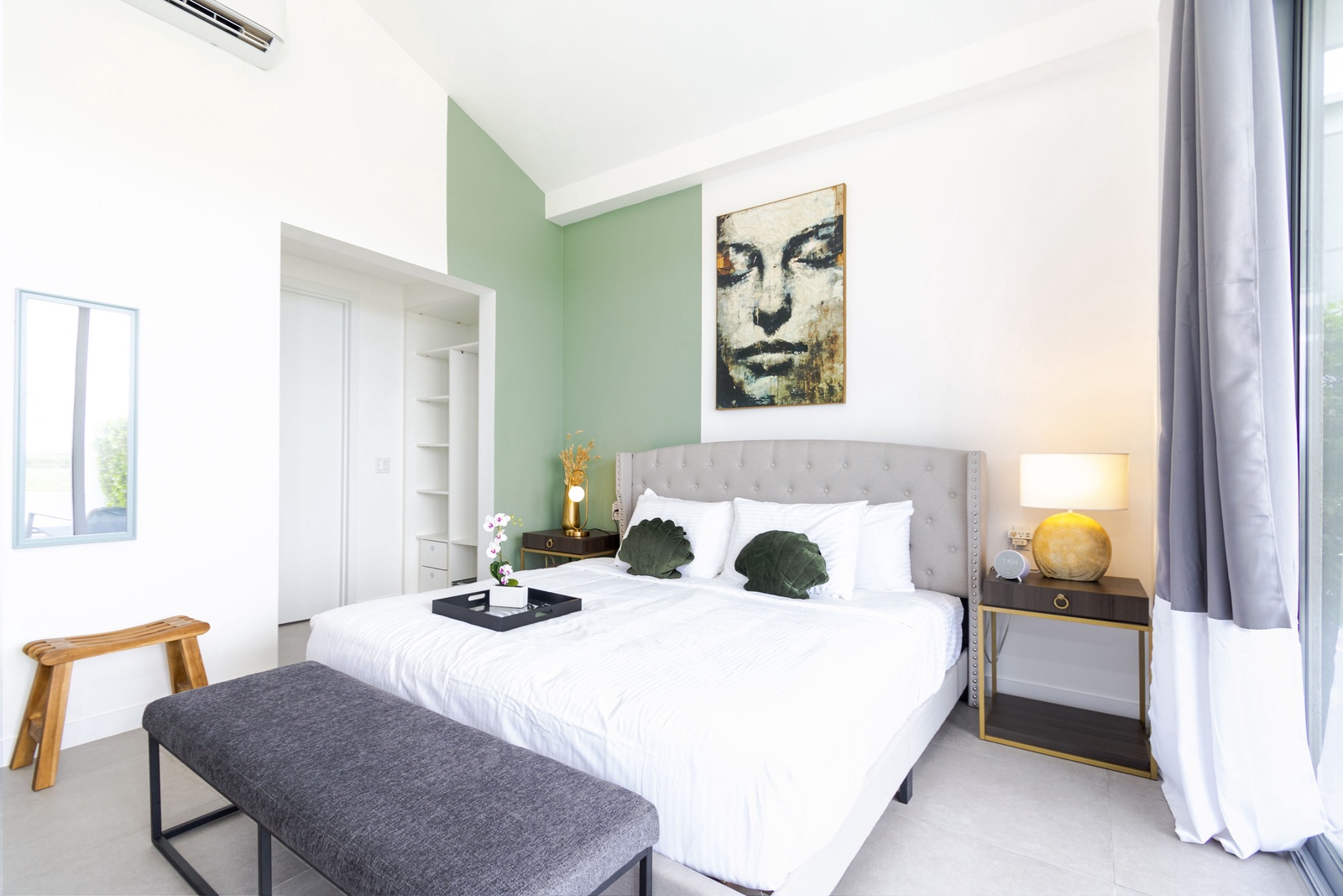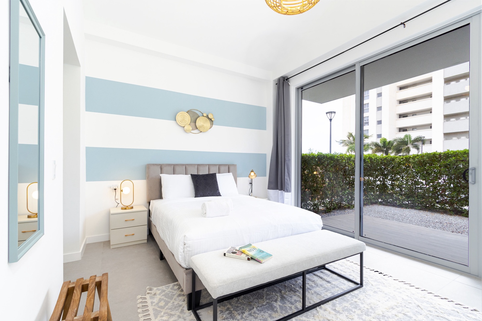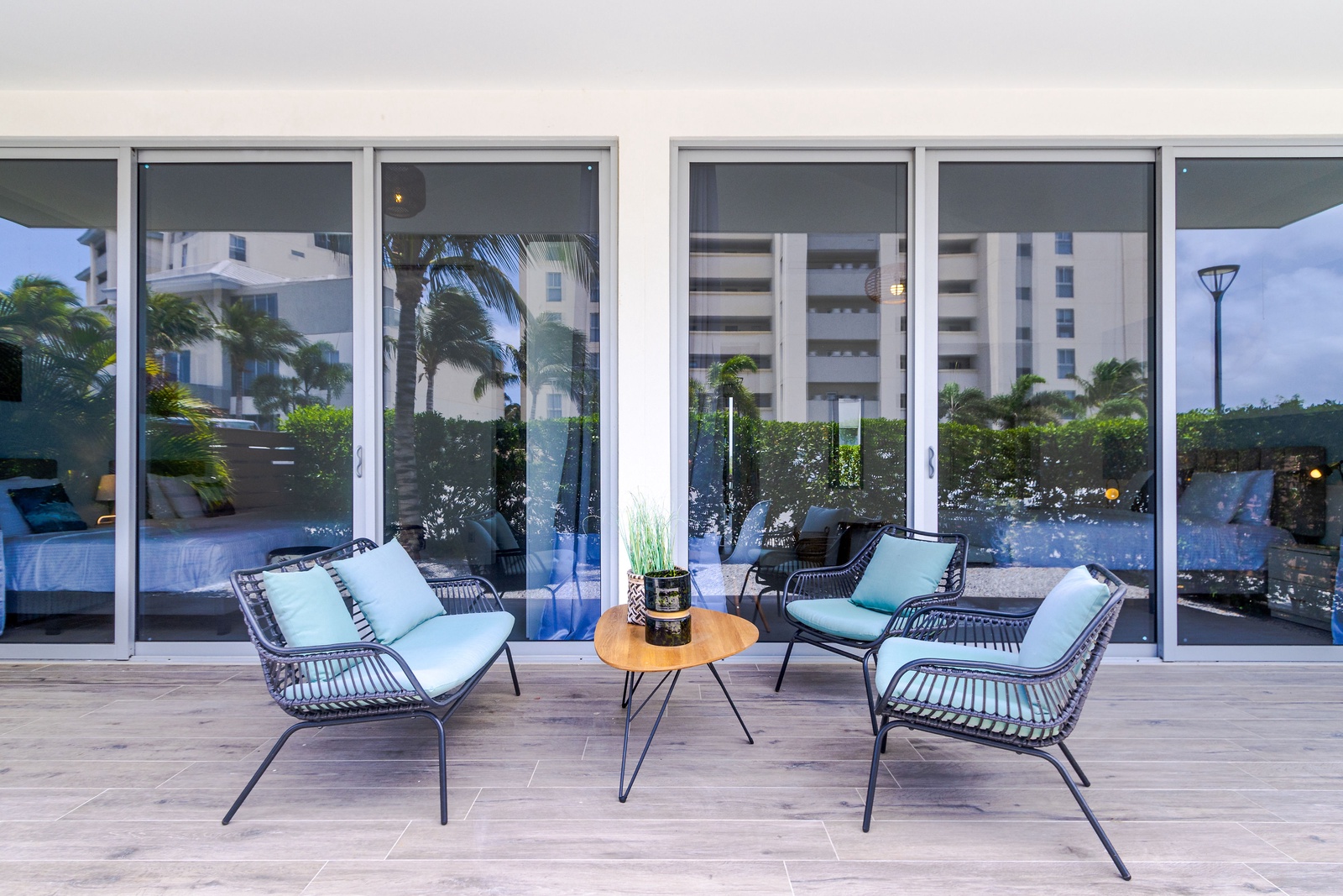 Each of the three bedrooms offers direct access to a balcony through sliding glass doors, where you’ll find comfortable lounge seating. Enjoy restful nights on luxurious mattresses with sumptuous bedding, and stay entertained with smart TVs in every room.