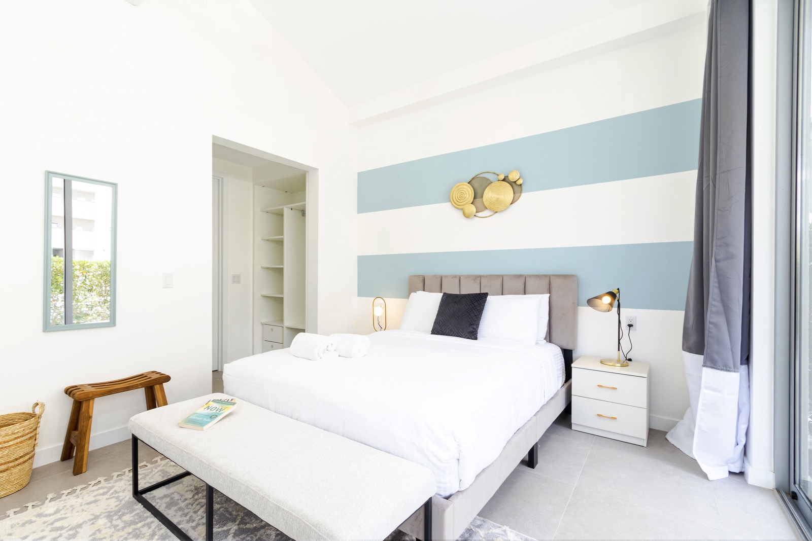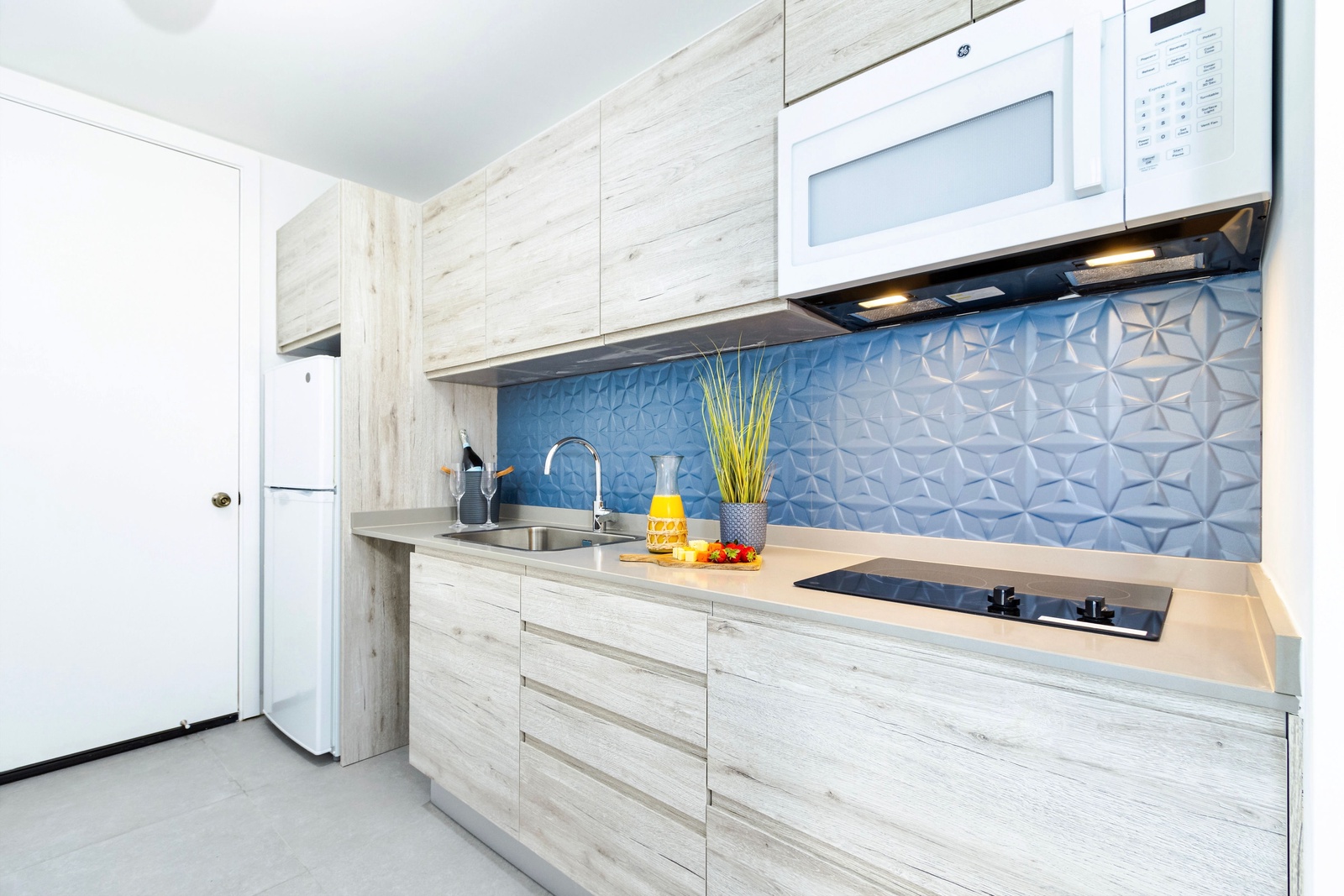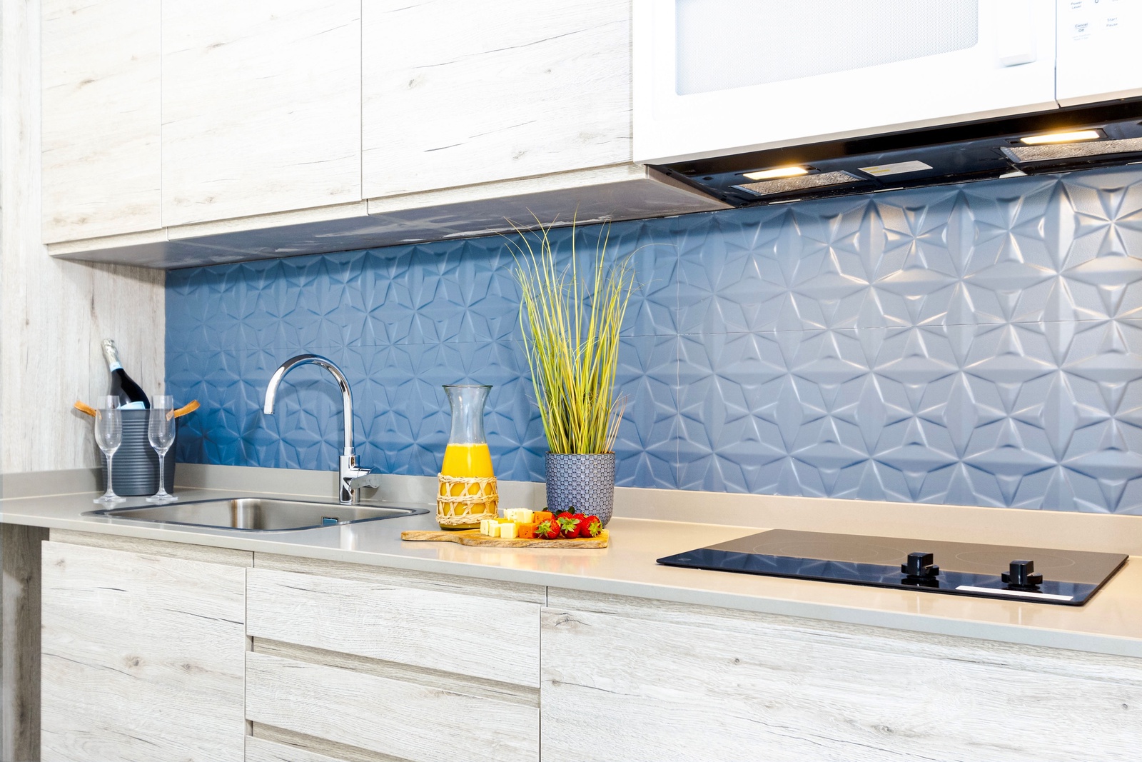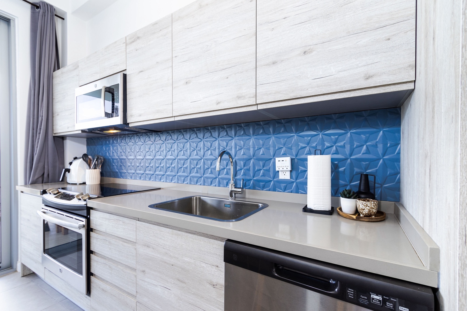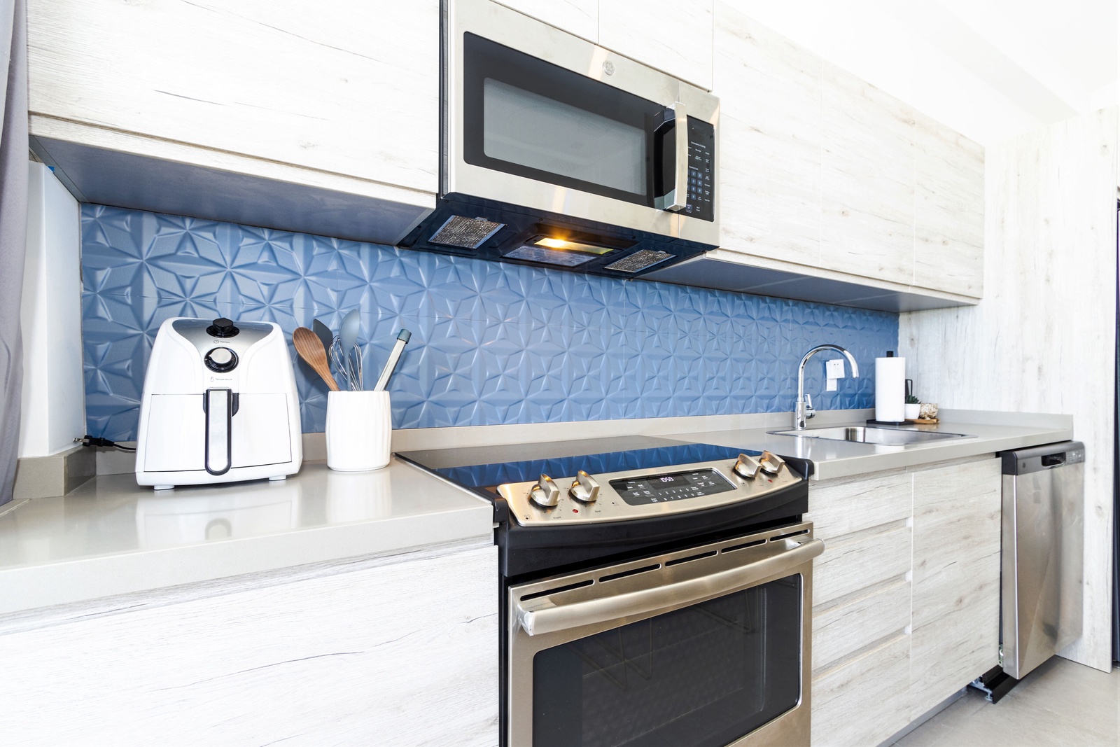 The heart of the home is a modern, fully-equipped kitchen that’s as functional as it is stylish. The duo-chromatic design features sleek gray quartz countertops, a striking blue backsplash, and custom cabinetry. Stainless steel appliances, including a side-by-side fridge with an ice maker, convection oven, microwave, and a vented four-burner electric stove, ensure you have everything you need to prepare your favorite meals.