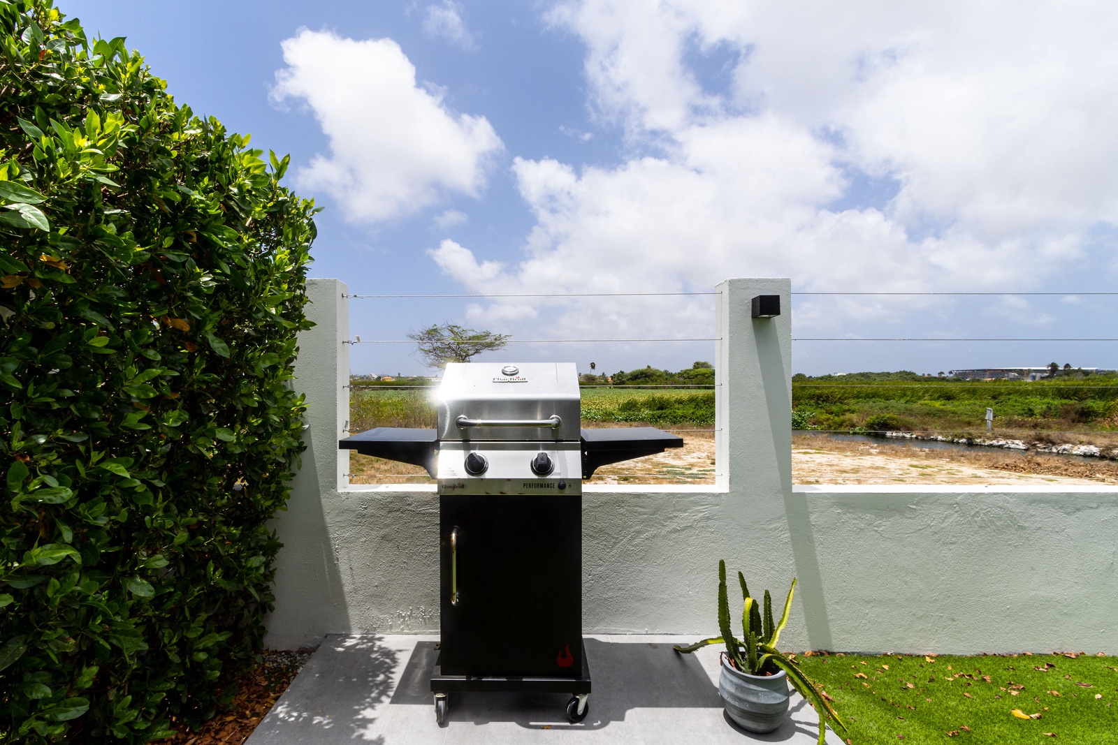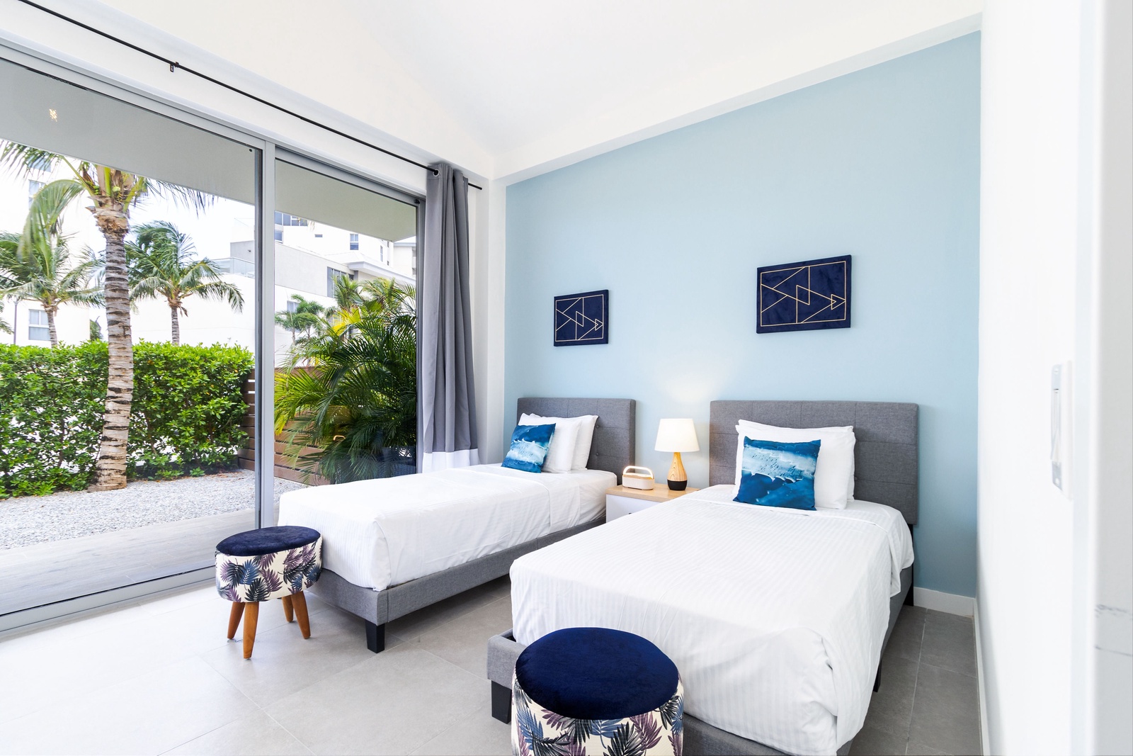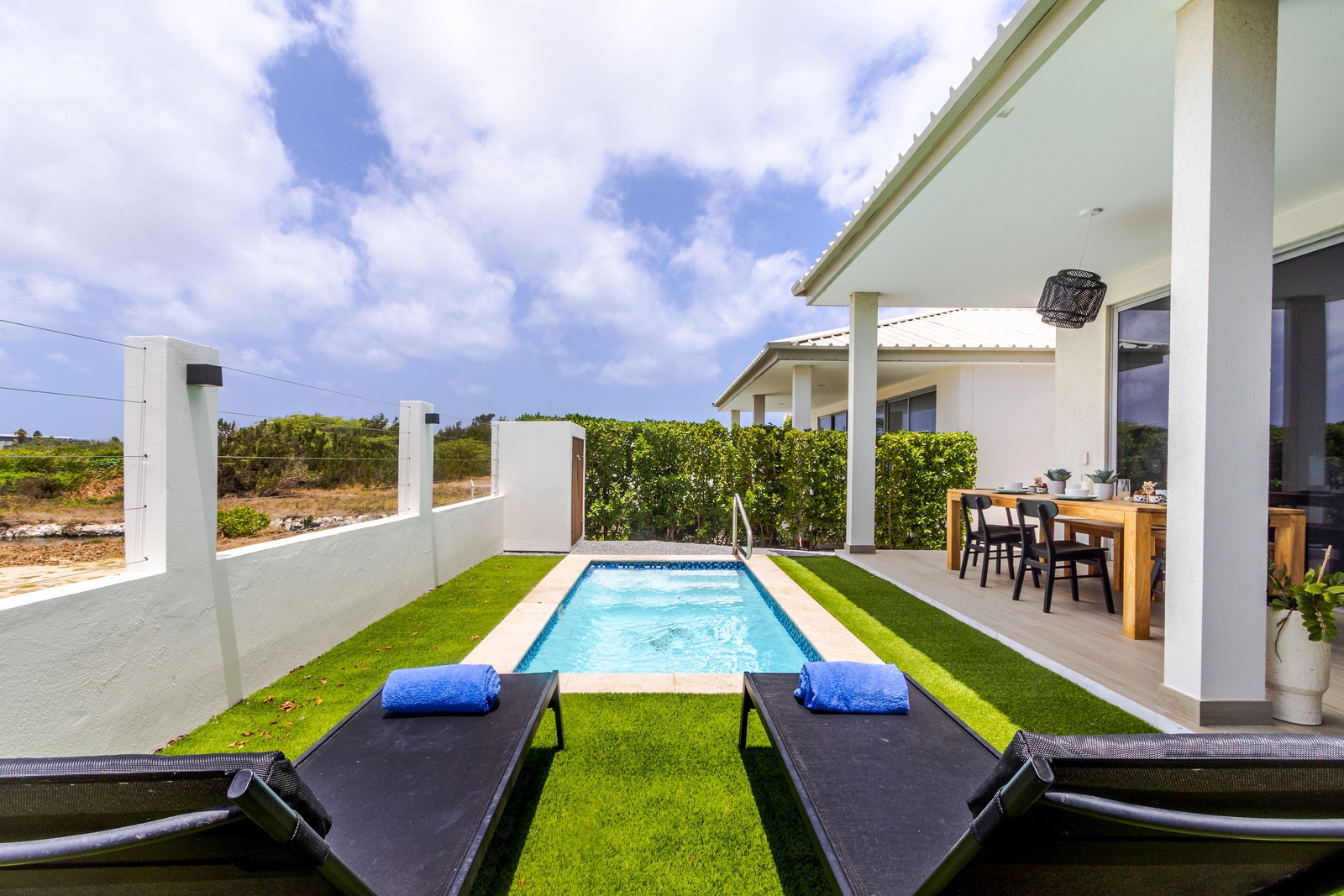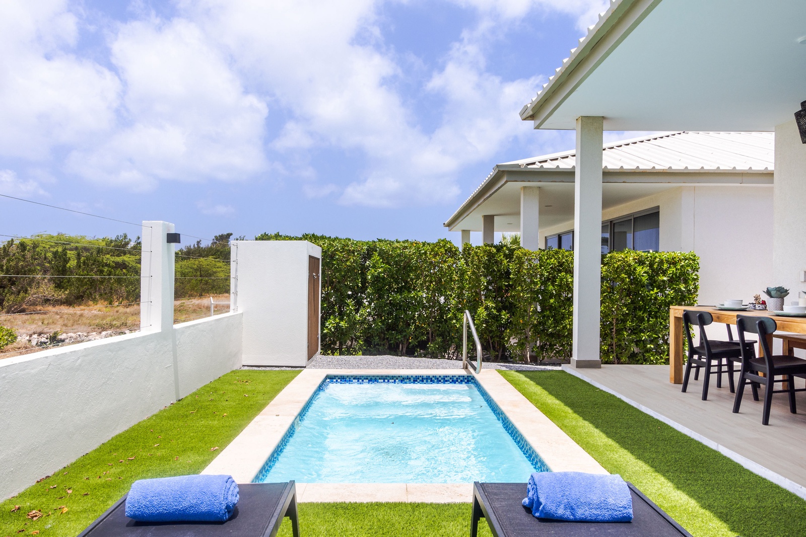 Exclusive chic modern 3 BR/2BA villa. This modern private villa provides the best of both worlds giving you a private backyard with plunge pool with amazing nature view of the “Bubali Plas” and the luxury of top class amenities of Azure Beach Residences located just steps from world renowned Eagle Beach.