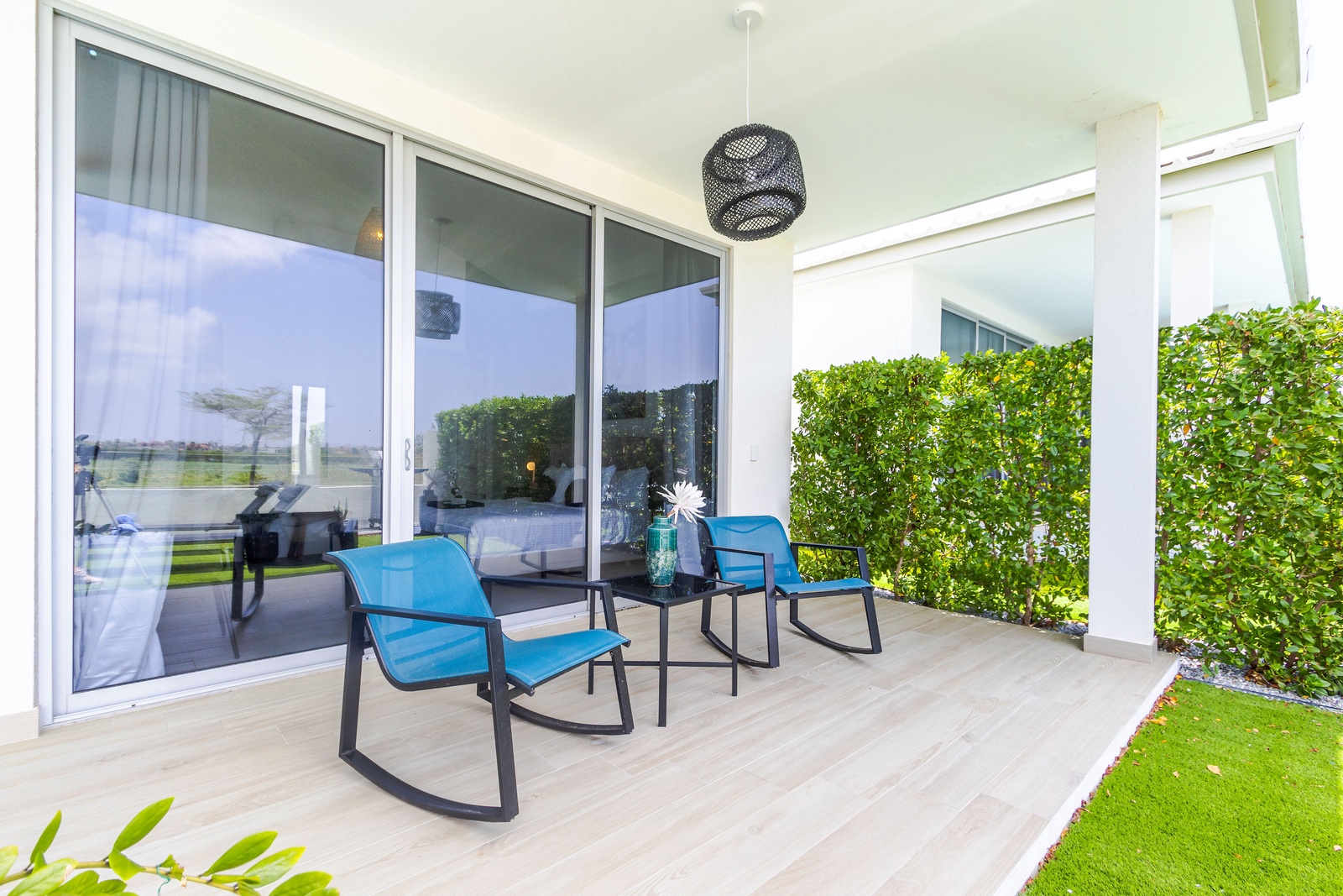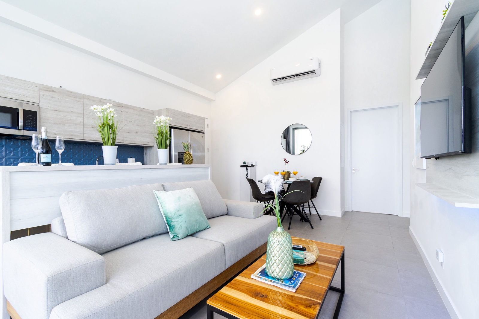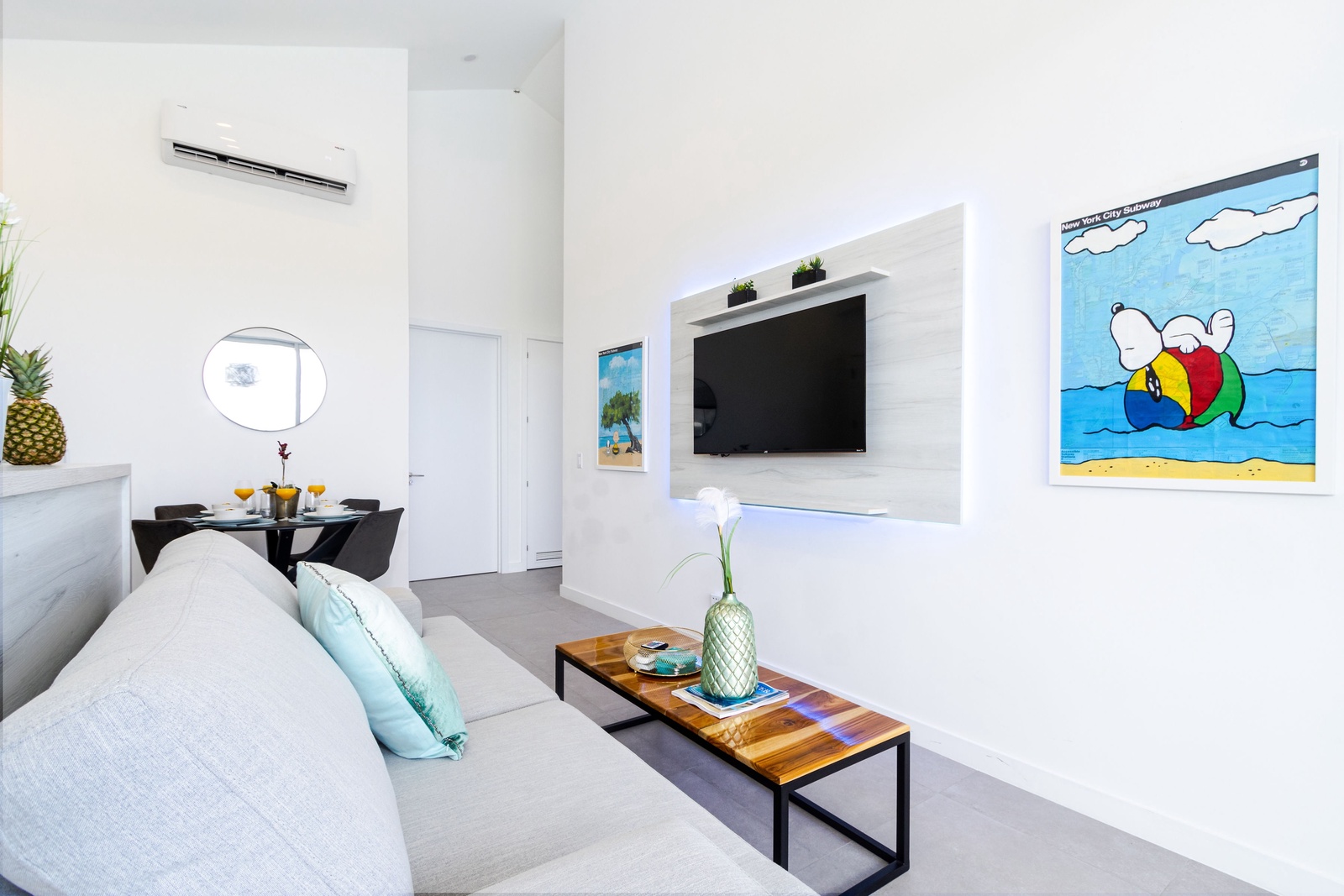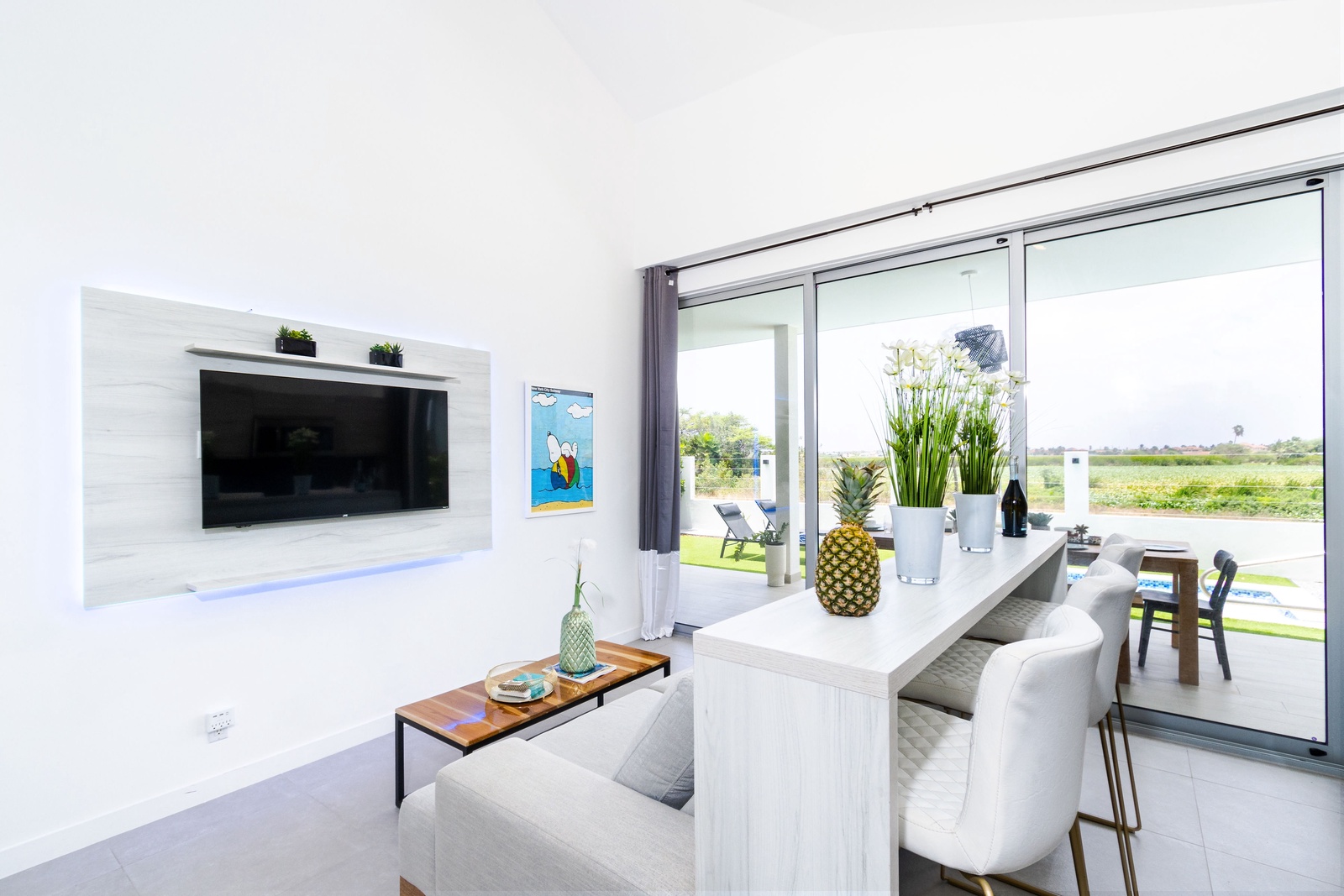 The open-plan living area is a chic, inviting space designed for relaxation and entertainment. The contemporary décor is complemented by vibrant artwork, creating a warm and welcoming ambiance. The plush sofa is perfect for unwinding with a movie or your favorite shows, while sliding glass doors frame tranquil views of the surrounding greenery and open up to the outdoor patio, blending indoor comfort with outdoor serenity.