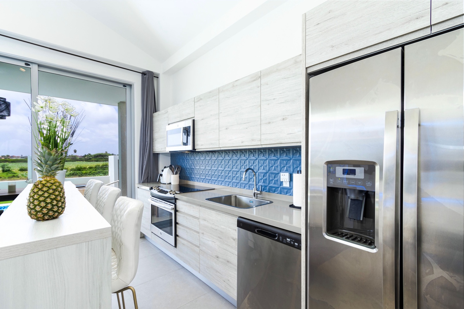 Start your day with a coffee at the breakfast bar, which seats three, or enjoy a Caribbean cocktail as you cook up a feast. The kitchen’s open layout ensures that the chef is always part of the conversation. For a more expansive dining experience, step outside to the patio, where you can enjoy your meal in the fresh morning breeze.