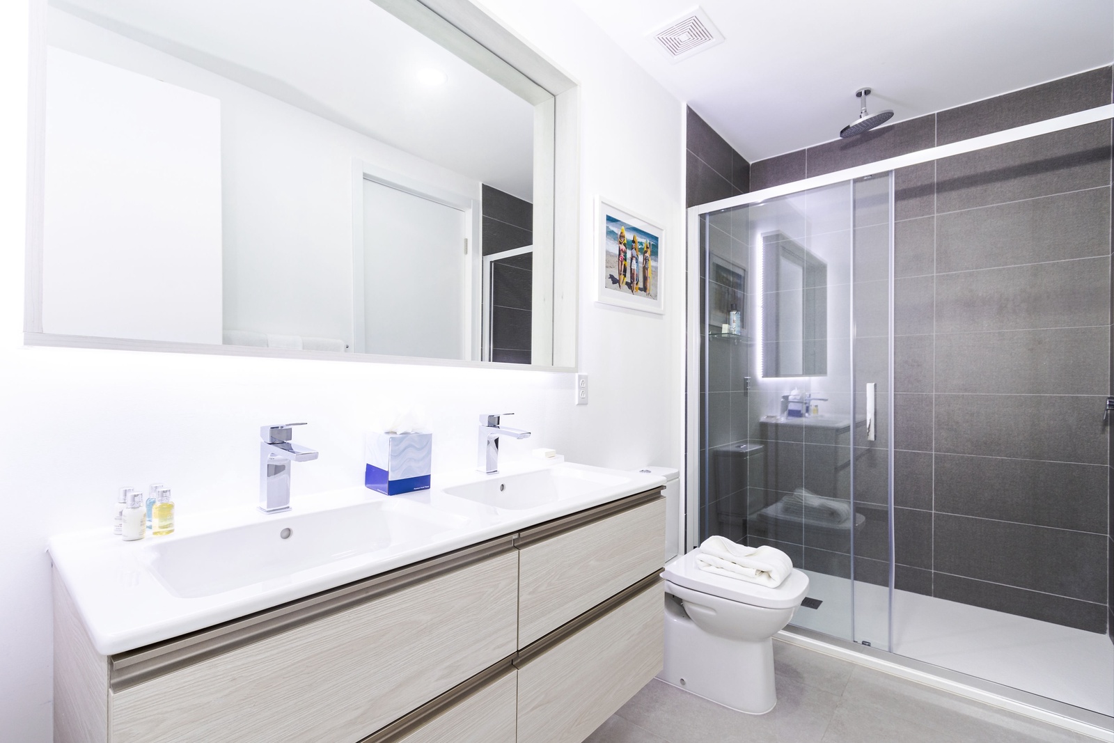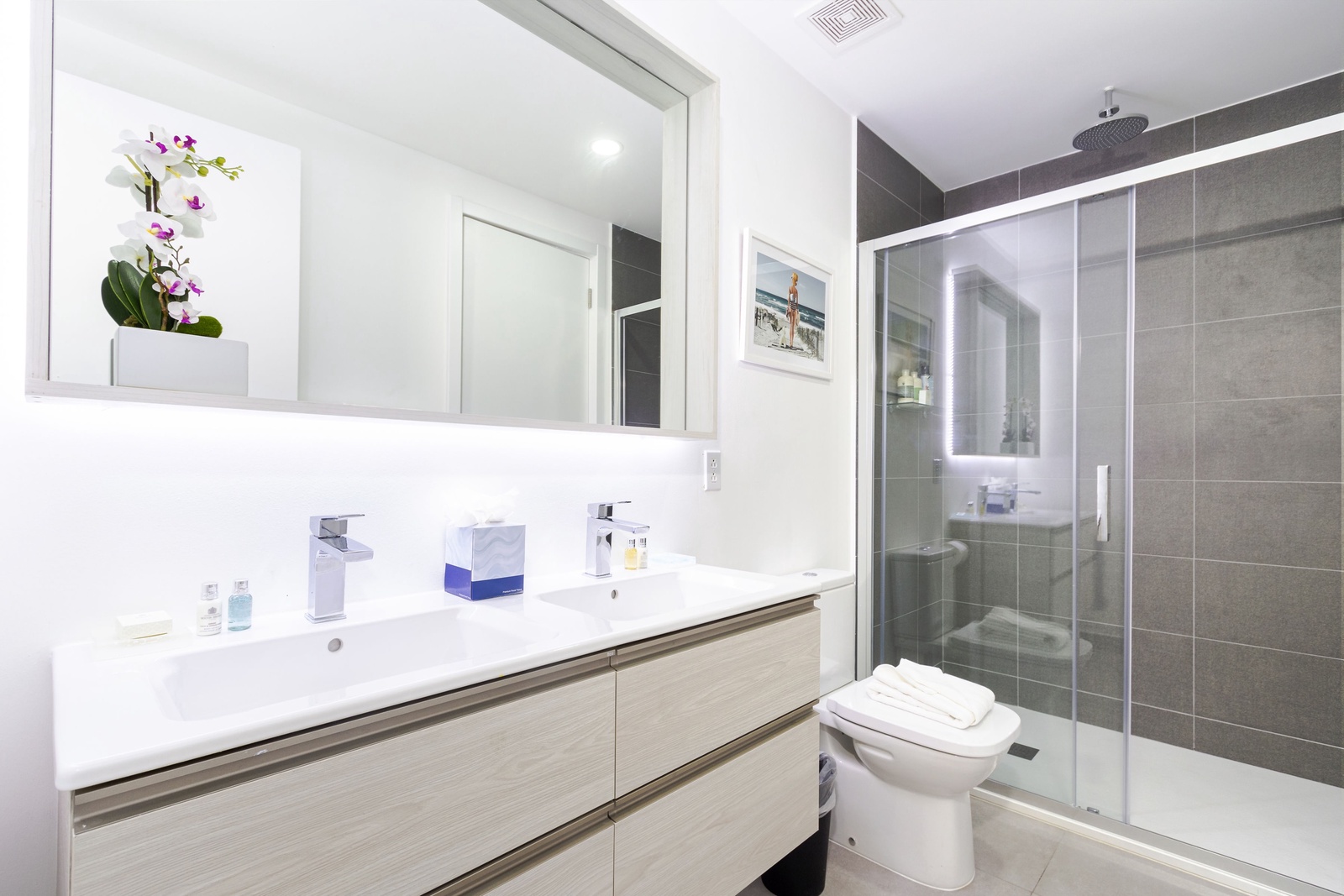 The bathrooms are a spa-like retreat, featuring glass-door walk-in showers with rain showerheads. The master bathroom boasts double sinks for added convenience. All bathrooms are stocked with plush towels, toiletries, and hair dryers. A laundry room with a stackable washer and dryer is also at your disposal.